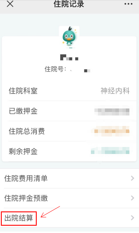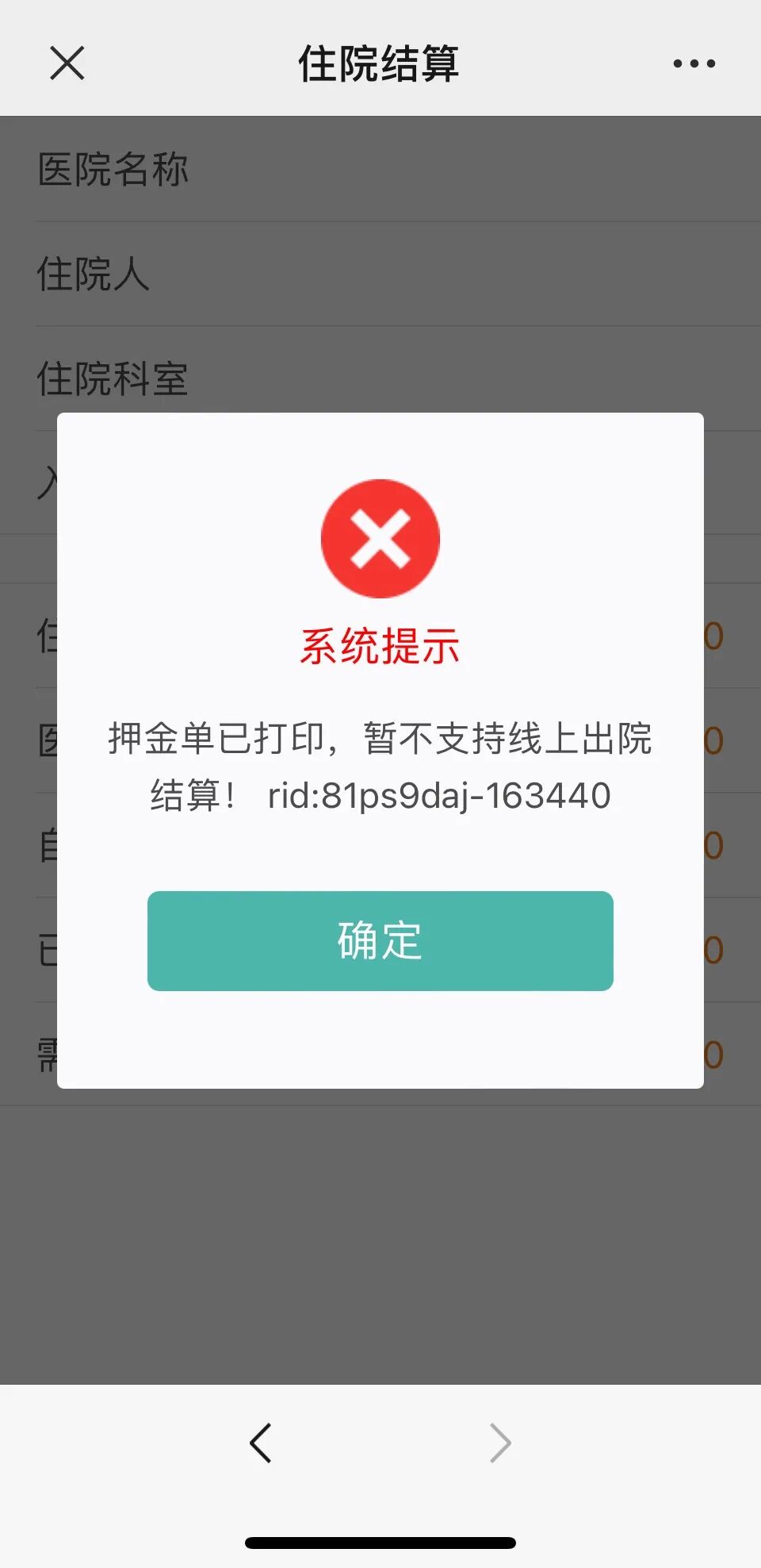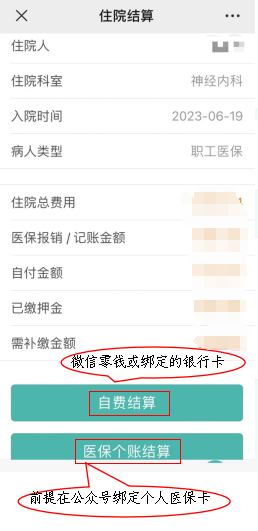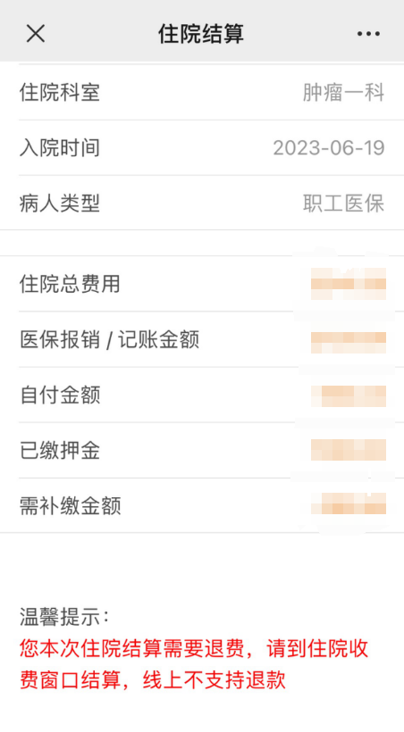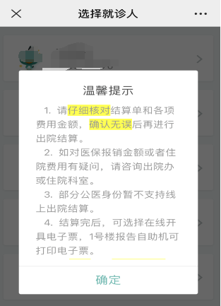 温馨提示:出现有以下两种情况无法线上自助结算,请移步到出入院办窗口办理出院手续。