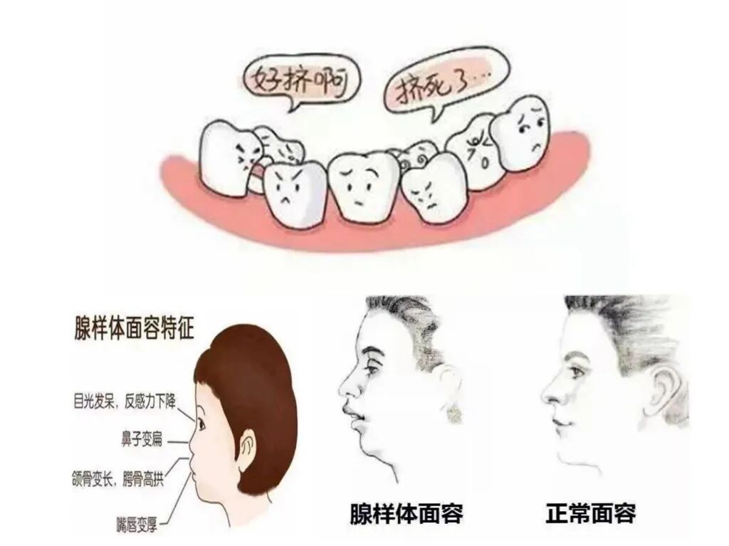 6. 用口呼吸影响颌骨发育,出现牙列不齐、嘴唇肥厚、龅牙等“腺样体面容”,影响面容及自信。