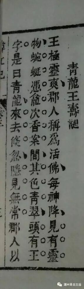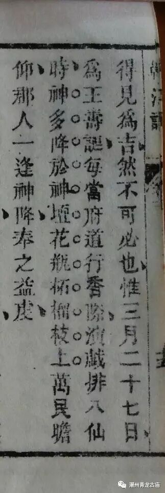 《韩江记·青龙王寿诞》载:“王极灵爽,郡人称为活佛,每神降见有灵物蜿蜒凭龛次香案间,其色青翠,头有王字,是日青龙来去悠忽,隐见无常,郡人以得见为吉,然不可必(不一定)也。惟三月二十七日为王寿诞,每当府道(台)行香际,演戏排八仙时,神多降于神坛花瓶,柘石榴枝上,万人瞻仰,郡人一逢神降,奉之益虔。”