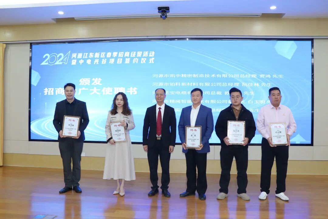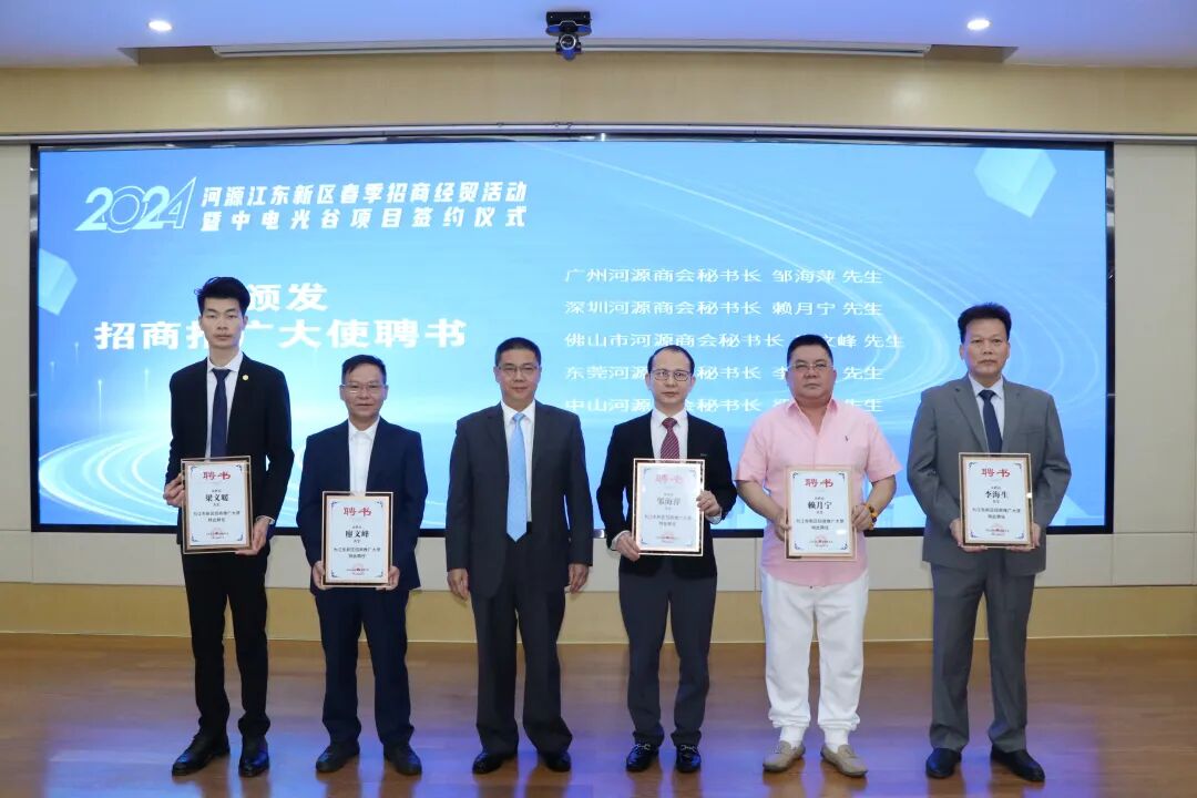 活动还为广州、深圳、东莞、佛山、中山等地河源商会代表和五家链主企业代表颁发江东新区招商推广大使聘任证书。江东新区发展财政局、江东新区经济促进局、江东新区自然资源和城乡建设局、江东新区产业园管委会部门代表作表态发言,致力为项目落地动工建设提供“店小二”式服务,确保新签约项目尽快落地和在建项目全速推进,快见成效。