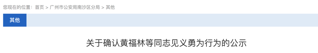对于五人的见义勇为事迹,广州市南沙区人民政府官网公示材料写道:黄福林、唐群辉、王国梁、郭圳钊、黄碧威五名同志在发现桥面断裂后不惧危险、主动担当,反应迅速,处置得当,成功拦截多名欲过桥的群众,成功防止了人员伤亡的进一步扩大,为保护人民群众的人身和财产安全发挥了极为重要的作用。