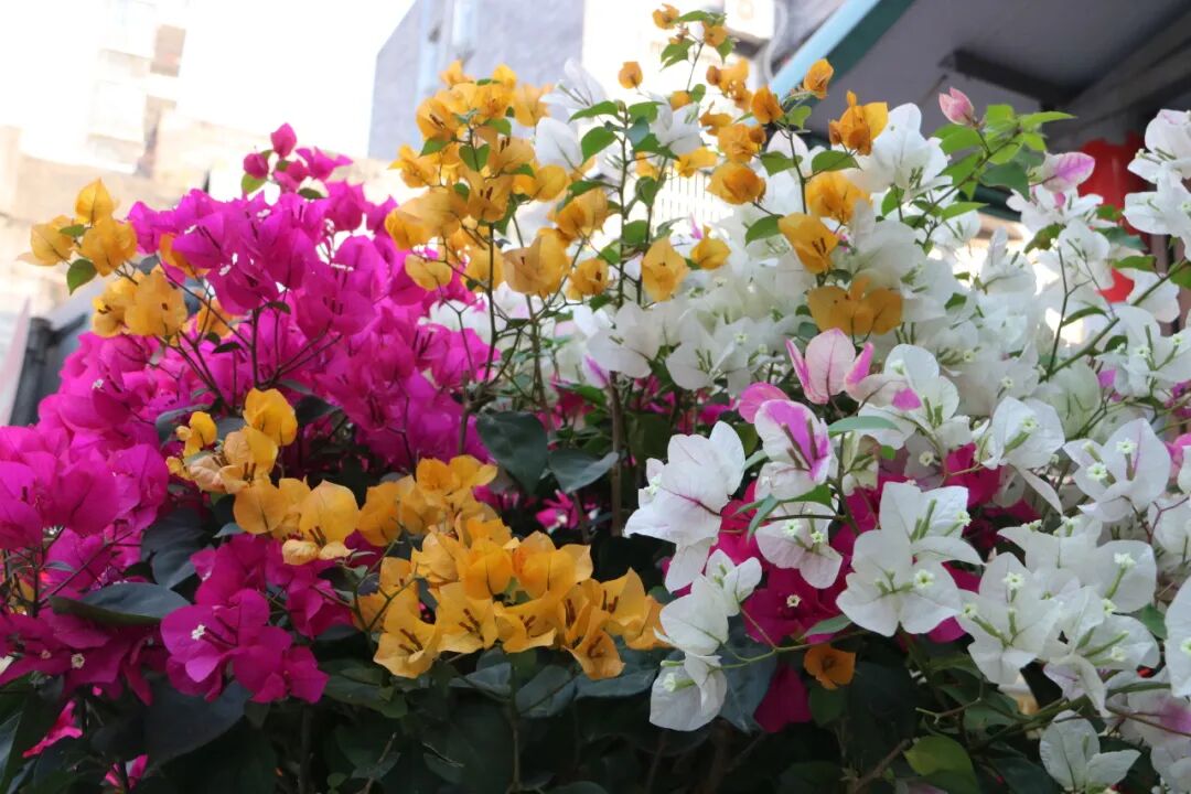 近日,在麻涌古梅风情街,沿街增添了不少盆栽花卉,崭新的花箱有序摆放,紫红色、大红色、橙黄色、白色等各色簕杜鹃迎风吐艳,把道路沿途装点得格外美丽,成为了一道道亮丽的风景线。
