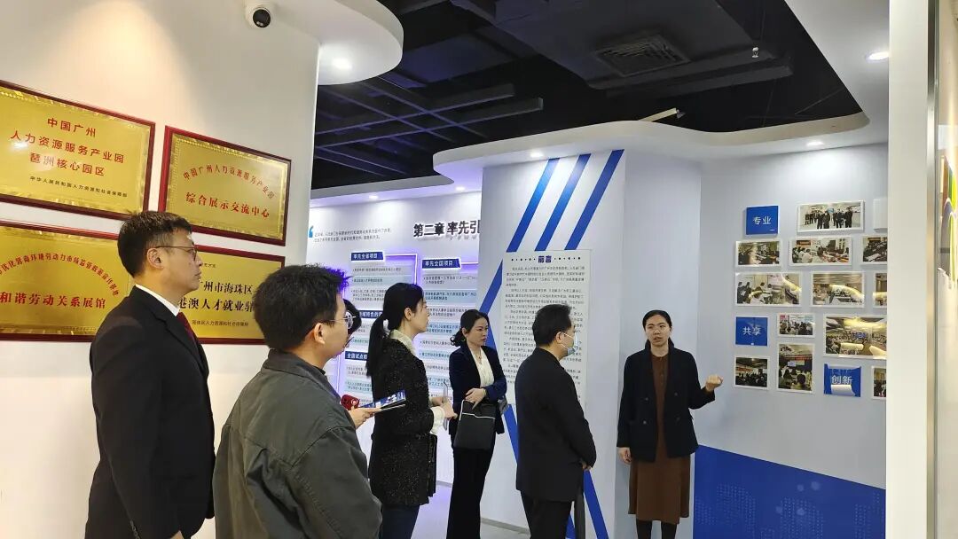 调研伊始,全体人员参观琶洲速裁站和新业态用工保障联盟,观看E法亭运行,详细了解琶洲速裁站和新业态用工保障联盟组织架构、运作机制、职能作用等工作建设概况,实地感受广州市人社部门在劳动者权益保障方面的创新发展。
