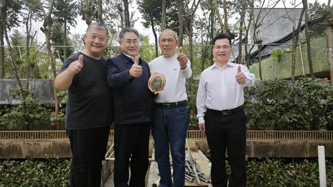 阳春三月,省人民政府参事、省乡村发展协会理事长钟韶彬同志率队到云浮市完璧金钱龟养殖有限公司基地调研,了解特色养殖现状、企业运行及其产业效益情况。完璧金钱龟养殖有限公司董事长赵良标陪同考察。