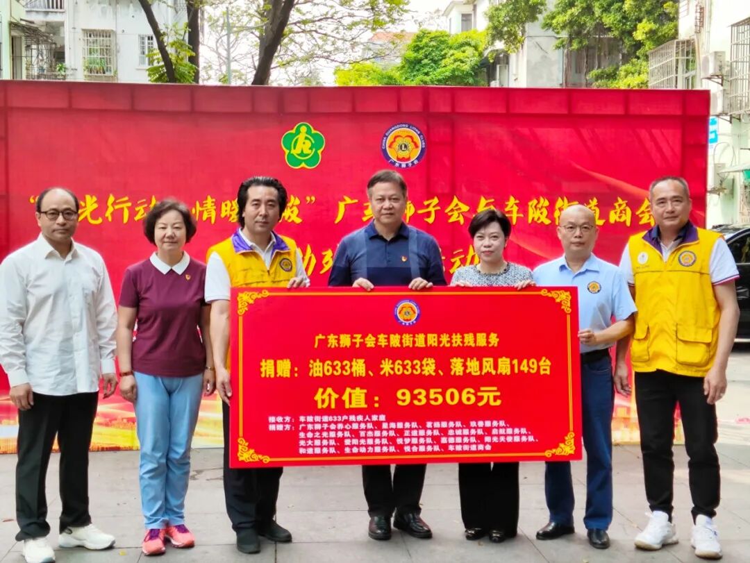 本次活动由广东狮子会养心服务队承办,广东狮子会会员管理三部支持,联合广东狮子会星海服务队、茗扬服务队、爱阳光服务队、玖善服务队、百杰服务队、生命之光服务队、正道服务队、忠诚服务队、阳光天使服务队、启航服务队、光大服务队、生命动力服务队、嘉德服务队、悦梦服务队、和道服务队、悦合服务队共同为车陂街道633户残疾人家庭给送上油、米等关爱物资,为社区内的149名特困残疾人家庭送上落地扇风扇,合计投入经费93506元。