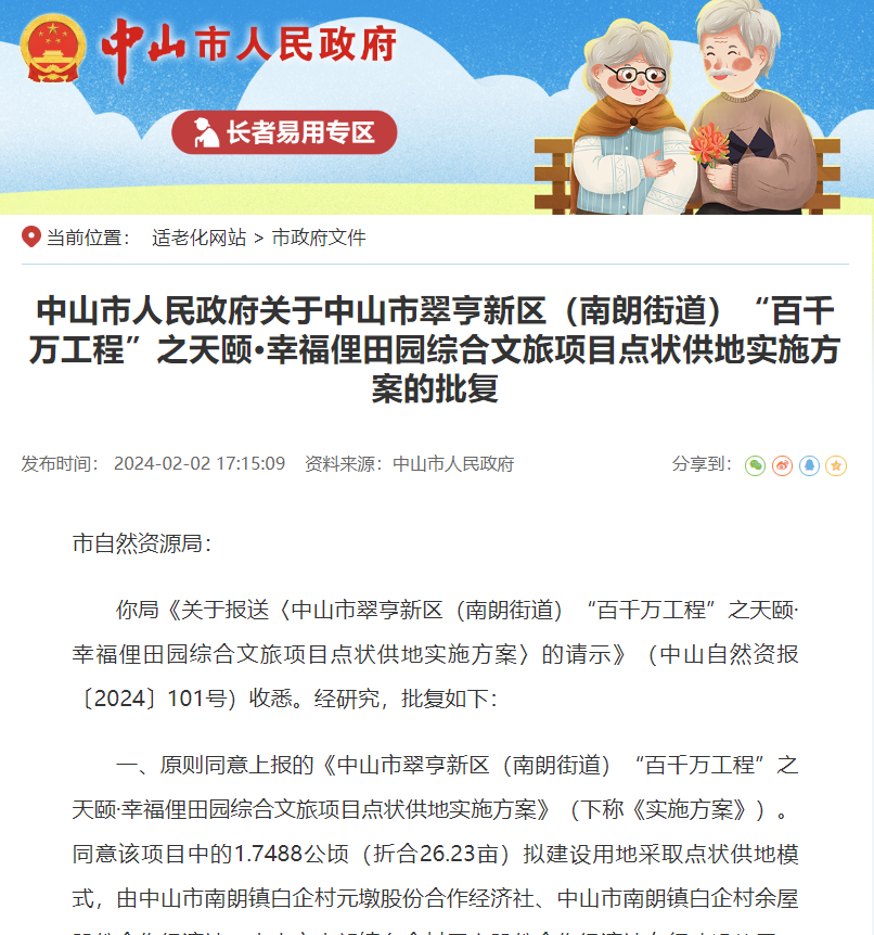 日前,中山市又一宗点状供地项目——天颐·幸福俚田园综合体文旅项目点状供地实施方案获得批复。这是中山市翠亨新区(南朗街道)文化旅游高质量发展的重点项目之一,该项目点状供地实施方案由国地科技编制。