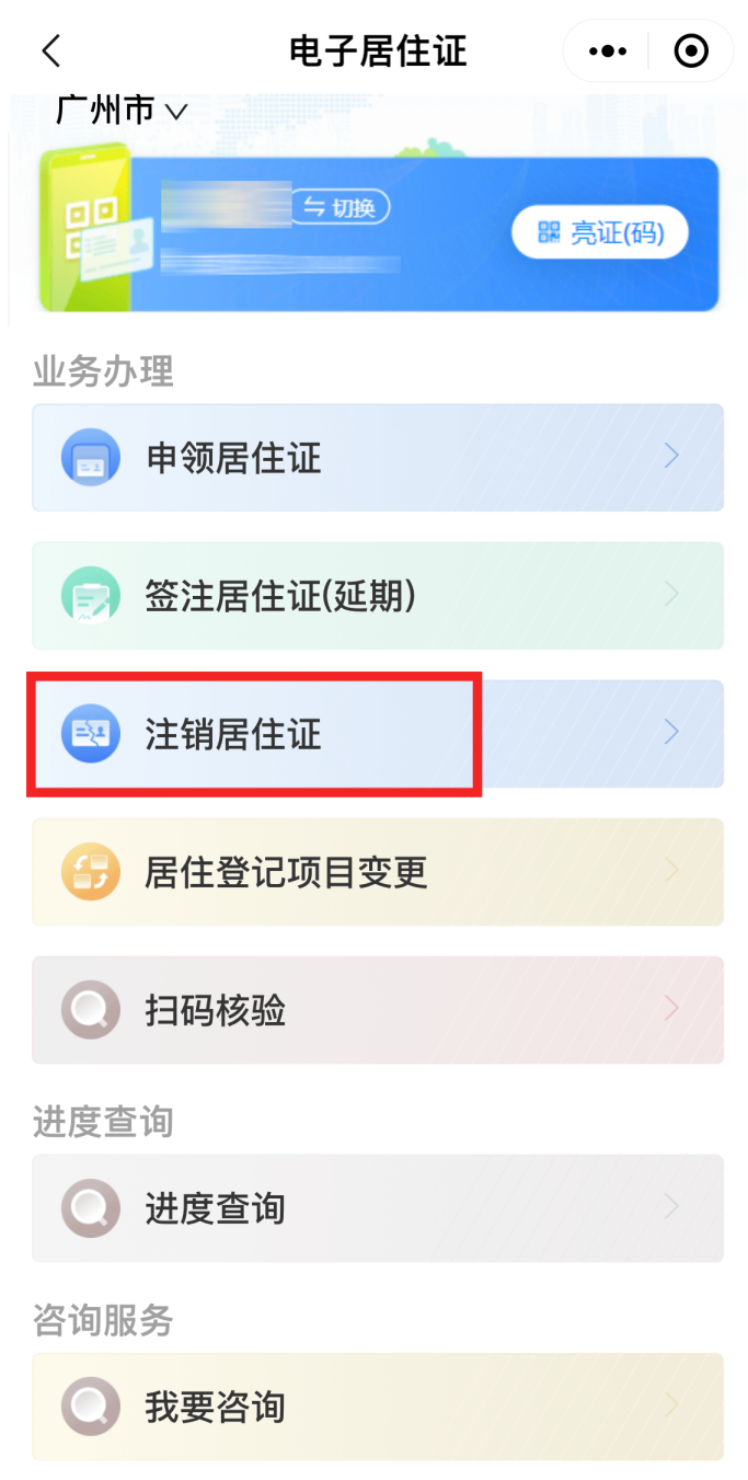 1.居住证业务首页点击【注销居住证】,选择【广州市】,进入办理须知页面;
