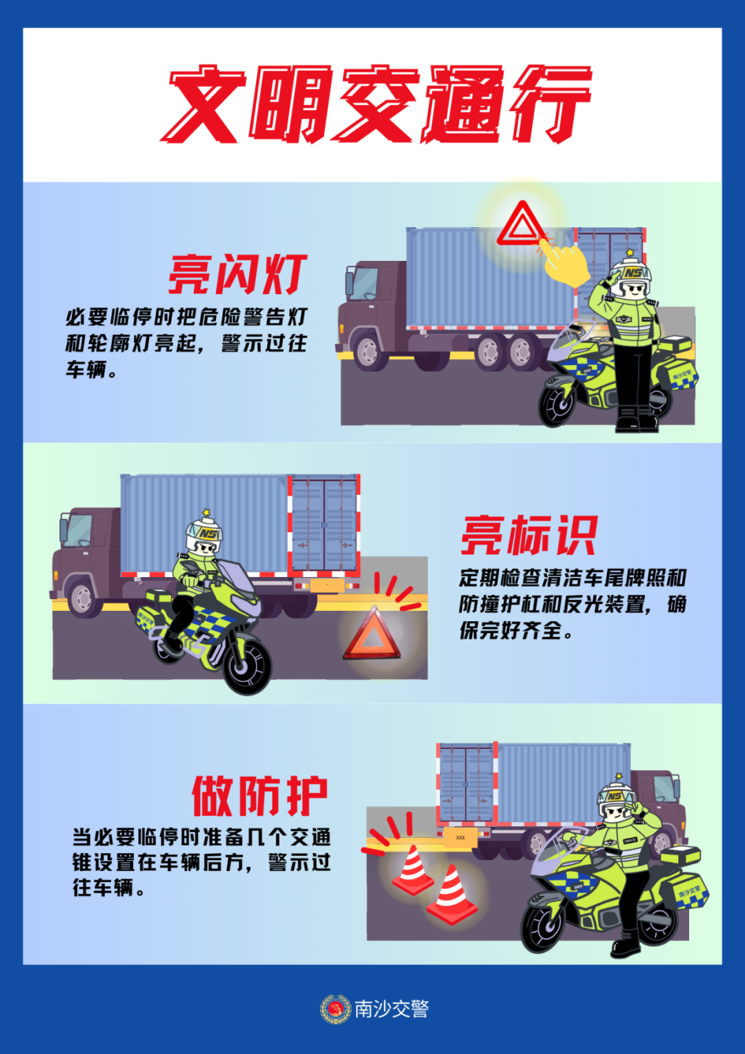 此外,南沙交警还督促企业落实安全责任,要求驾驶员在停放车辆后,在后方放置警示设施(例如:反光锥、三角警示牌、警示杆等)。同时提醒驾驶员不随意停放车辆,不要疲劳驾驶,引导驾驶员牢固树立“安全第一”的思想。