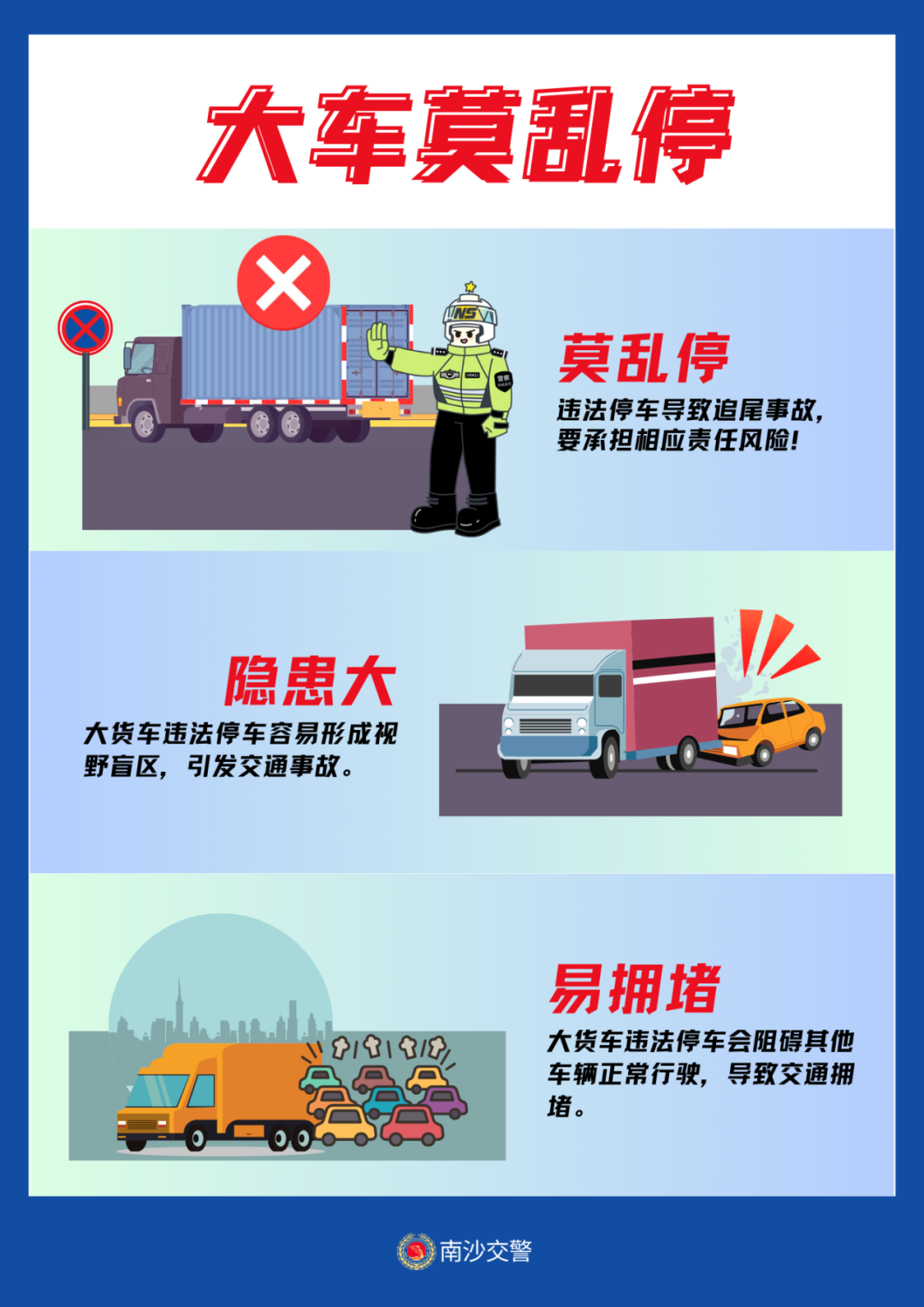 针对货车在路边临时停放极易引发追尾事故的特点,南沙交警为货车驾驶员灌输“小细节”避免“大事故”理念。