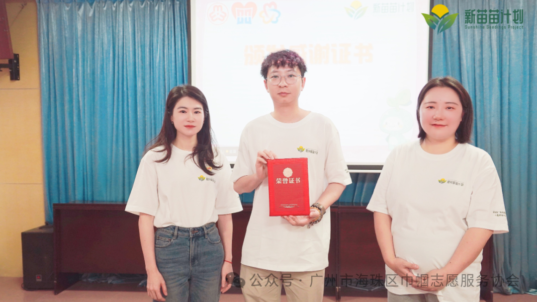 公益在行动,企业献爱心。多方公益爱心企业对本次项目提供大力支持,其中,广州光合未来科技文化传媒有限公司(以下简称“光合未来”)CEO赵文俊特别为“新苗苗”计划项目设计四个“喜怒哀乐”不同情绪的陪伴IP,生动形象的表现出“新苗苗”的活力。为表示感谢,在活动上向光合未来设计团队颁发感谢状。