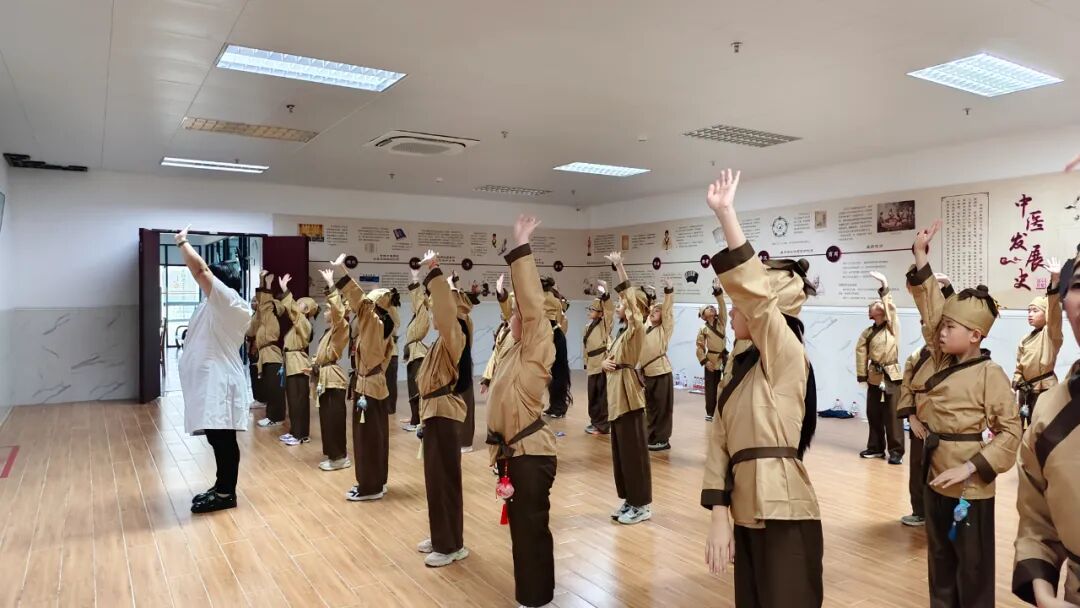 在钟药师的带领下,孩子们饶有兴致地学起了“八段锦”,一招一式学的有模有样,得知常练八段锦可以让身体变得更棒,还说要带上爷爷奶奶爸爸妈妈一起练。