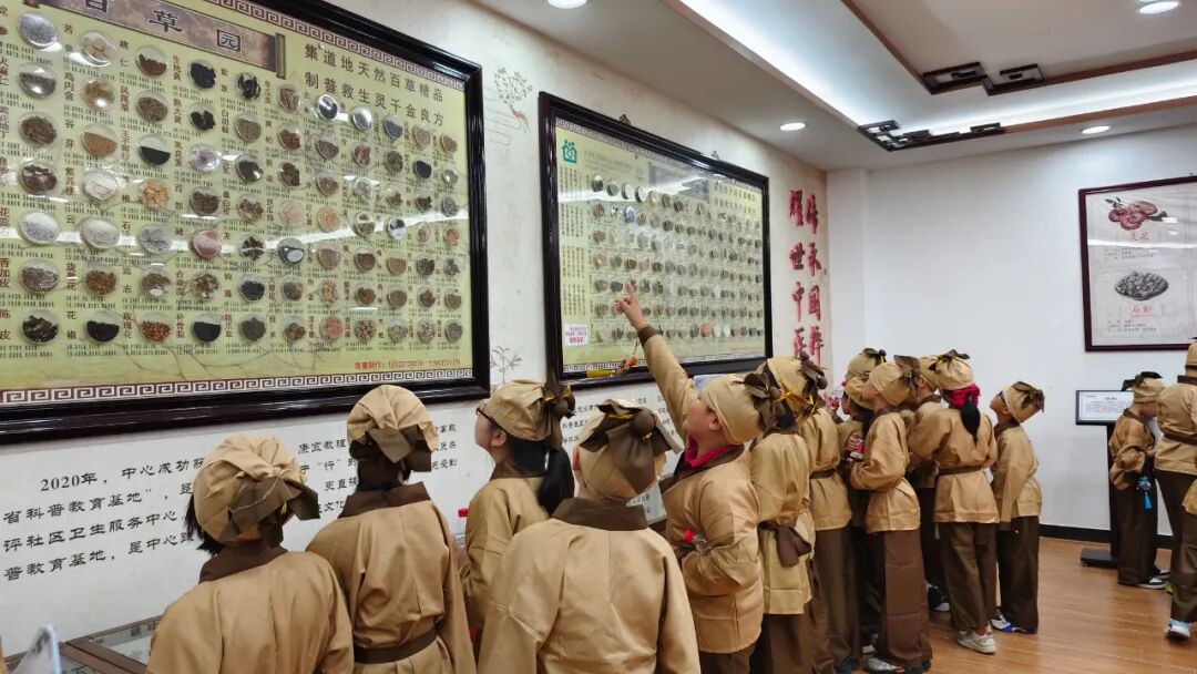 课堂结束后,小药童们参观了中医药科普教育基地,近距离观看"百草园"各种药材的标本,了解中医药历史,感受中医药的源远流长和博大精深。