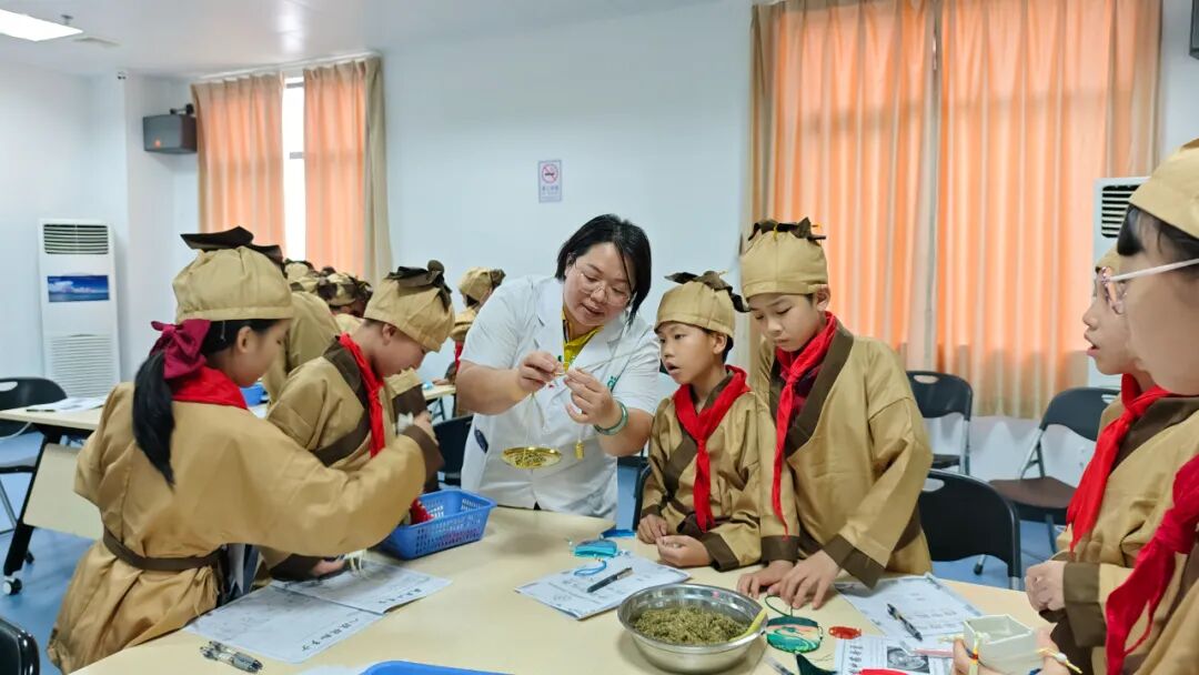“我们要使用戥秤称药制香囊,首先左手担秤杆,接着右手提起,眼睛平视秤杆刻度将香薷、薄荷等调制好的药粉称量.....”钟杏贤中药师话音刚落,小药童们纷纷跟学了起来,生怕错过哪个细节。不一会,在孩子的巧手下,一个个香囊包“闪亮登场”。