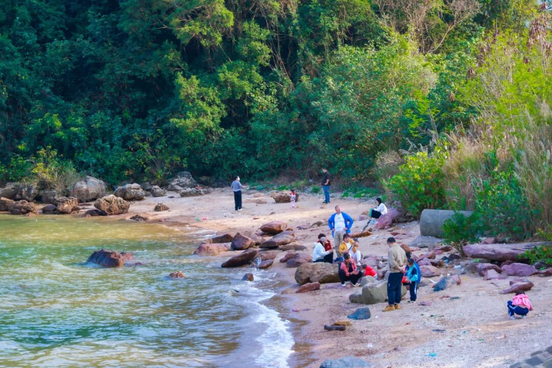 在绿道一处,有个浅浅的岩石沙滩,不少游客捡海螺,抓螃蟹,在这背靠青山,与海天连成一线的美景下,随便一拍都像大片。