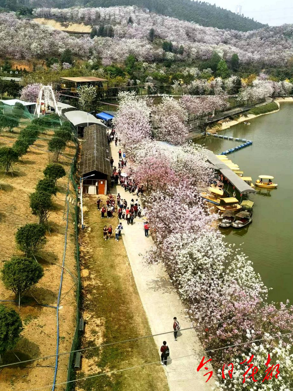芳菲四月,花都处处繁花似锦,美丽如画。在赤坭镇,漫山遍野十万株宫粉紫荆竞相绽放,带来不一样的“粉色”浪漫。