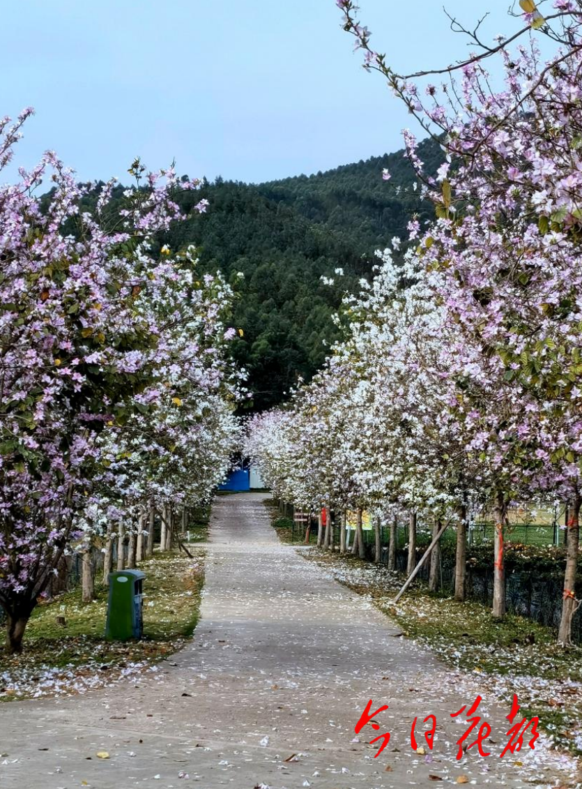 灿烂的阳光下,宫粉紫荆随风摇曳,花朵如同蝴蝶般在空中翩翩飞舞。蓝田紫林·童心小镇(原志惠农场)园区总面积3000亩,种植的宫粉紫荆有1000多亩,约10万株左右,是目前广州地区最大的宫粉紫荆种植基地。