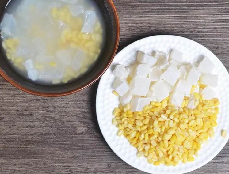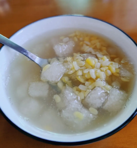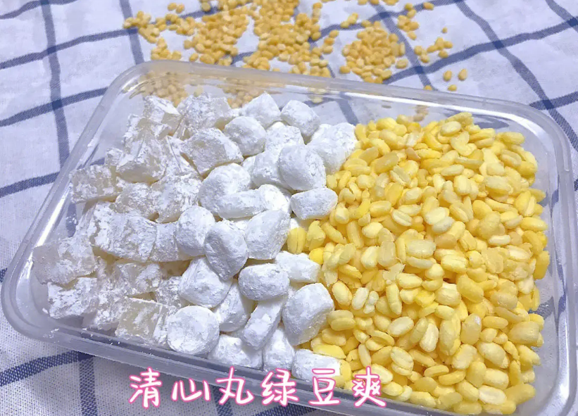 夏季时,各农贸市场都有做成小方块的清心丸和蒸熟的绿豆畔卖,买回去用糖水一煮就能吃了。