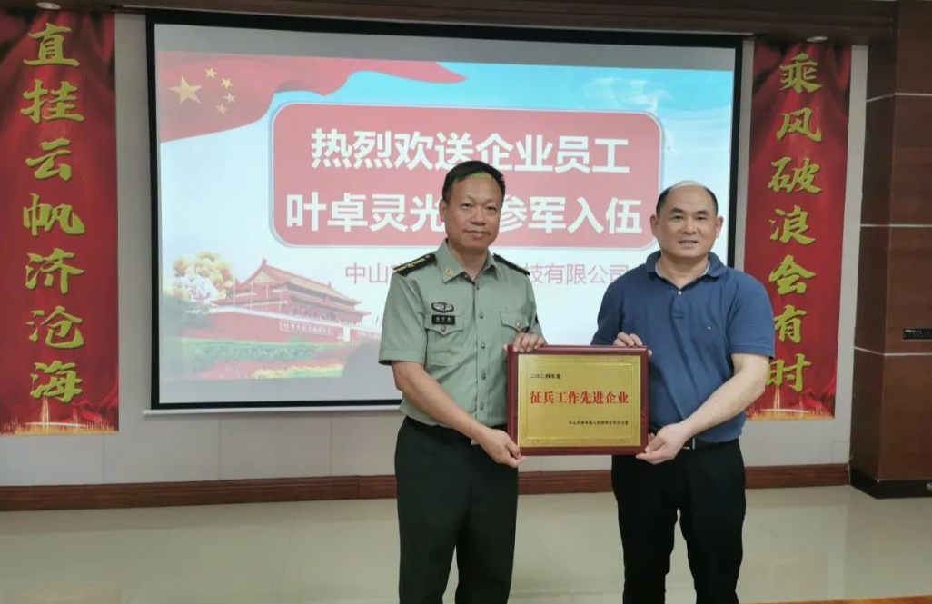 (通讯员:苏杰浩)近日,中山市板芙镇党委副书记高可攀为中山市泓溢薄膜科技有限公司颁发该镇“征兵工作先进单位”牌匾,感谢其对征兵工作的支持。