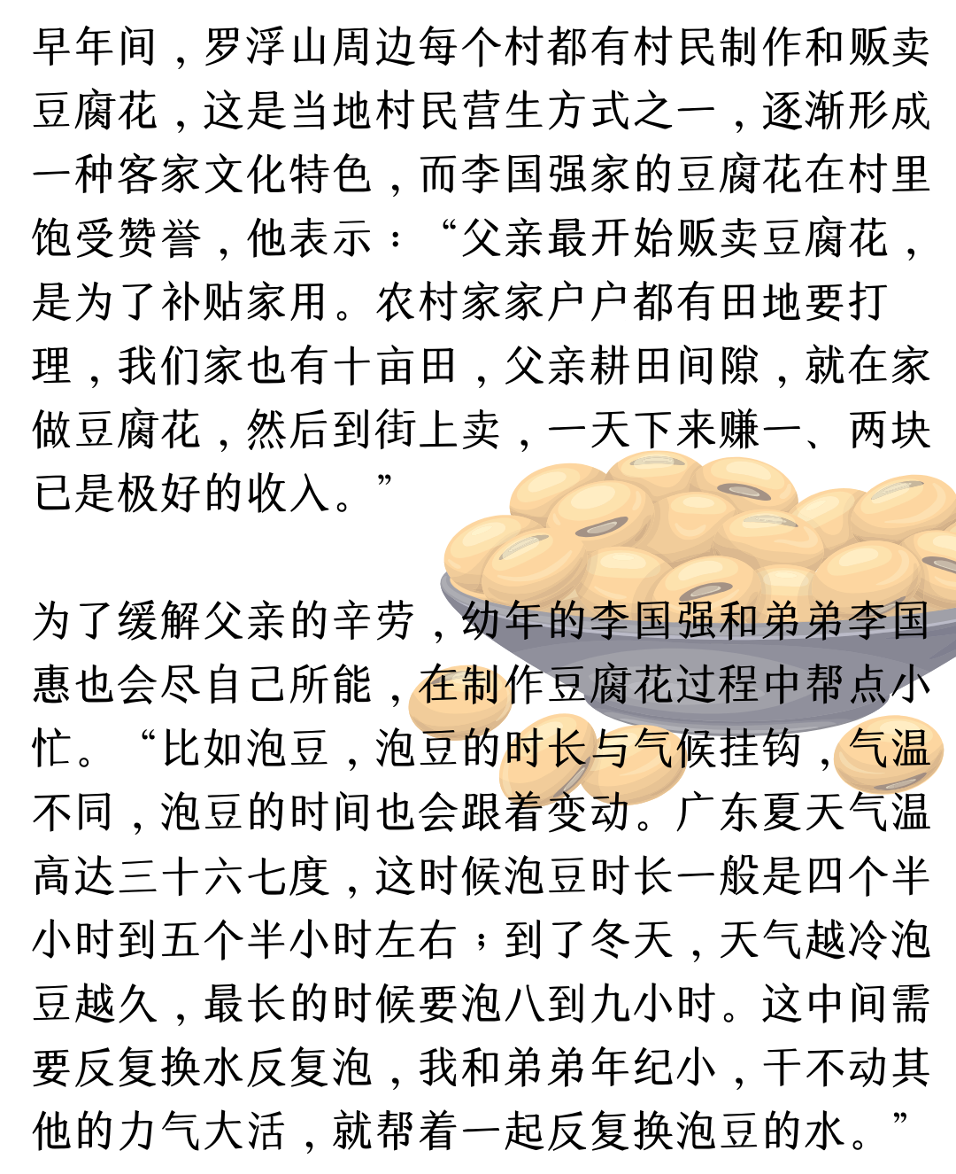 对于平民小食在时代发展中摇身一变成为工厂生产小食,李家长辈们都感慨万千。谁也没想到一碗小小的豆腐花可以走出村庄,走出县镇,迈向省市乃至全国。然而对于李国强与李国惠兄弟这辈人而言,发展豆腐花制作技艺和推广客家文化早已默默成为目标种植在他们心中,将技艺变为经济,是刻不容缓也是势不可挡的发展历程选择。