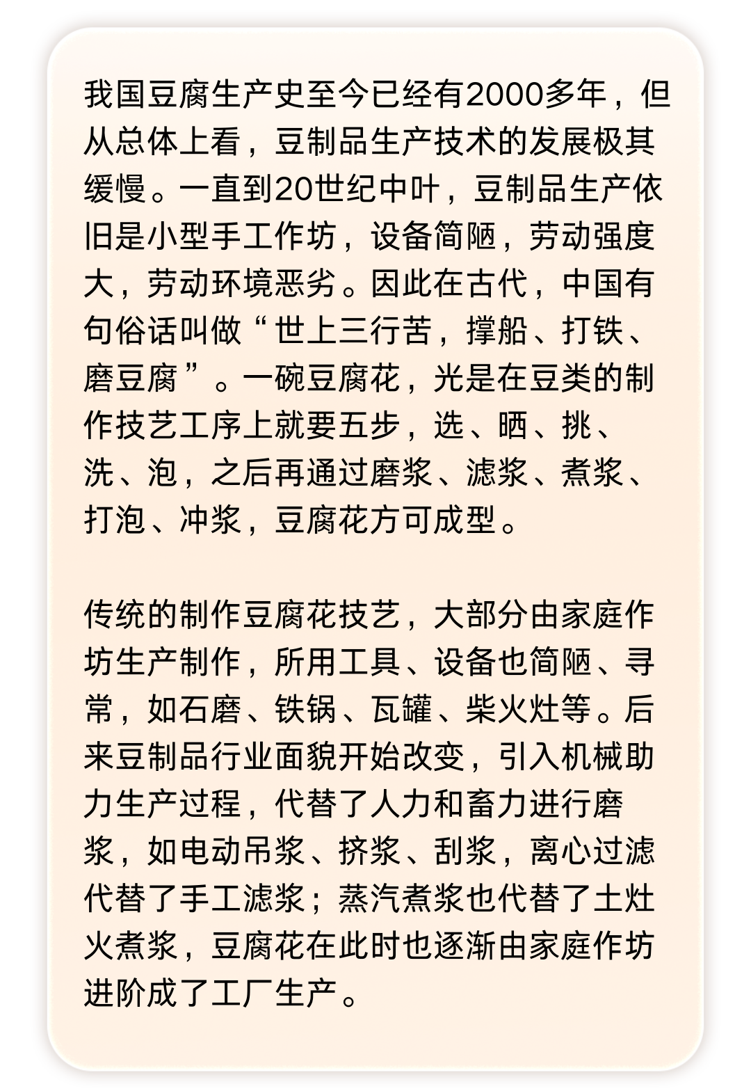 在改良研发制作技艺过程中,厂子首创了现有的豆腐花生产技艺。李国惠骄傲地说:“市场监督管理局审查了该技艺后,认可该制作技艺更符合食品安全卫生标准,要求其他的豆腐花制作厂都必须更换成这种制作技艺,不然不能通过审查,即无法拿到生产许可证。可以说,当时包括现在全国各地的厂子都在用这个制作技艺流程。”