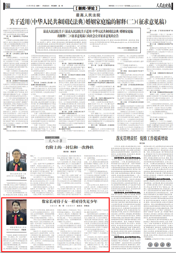 在刘金良心里,未成年人是国家的未来、民族的希望。“我们做少年审判工作不止于坐堂审案,对这些暂时‘掉队’的失足少年,我们不能一判了之,要像家长对待子女一样,多点耐心、细心和真心,为他们撑起健康成长的法治蓝天。”