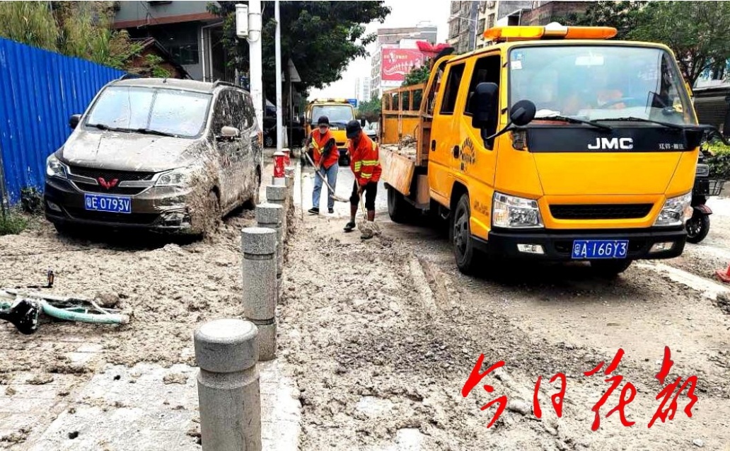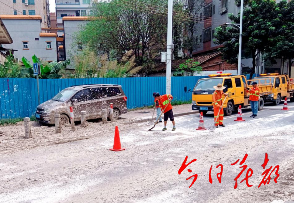 工作人员行动迅速,先用泥铲进行清理,随后洒水车配合人工清洗,最后使用洒水车进行反复冲洗。经过约两个小时的奋战,污染路面的泥沙全部清理完毕,突发事件安全隐患得到果断处置,快速恢复公路安全顺畅,保障了市民的正常出行。