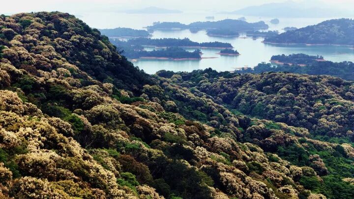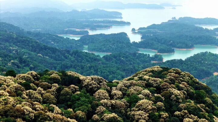 在每年春夏交替之时,万绿湖畔的椎树便会次第盛开,一束束花簇相拥,将万亩青山“染”成白色,远眺像茫茫白雪罩着青山,近看又似冰凌满枝头。
