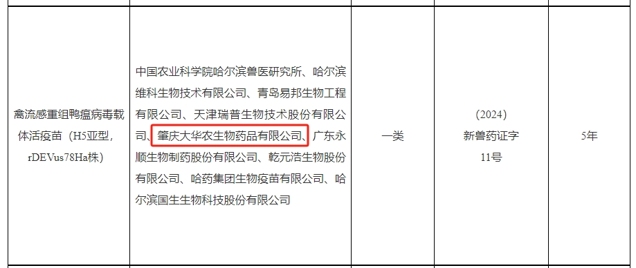 大华农禽流感重组鸭瘟病毒载体活疫苗(H5 亚型,rDEVus78Ha株)获国家一类新兽药证书