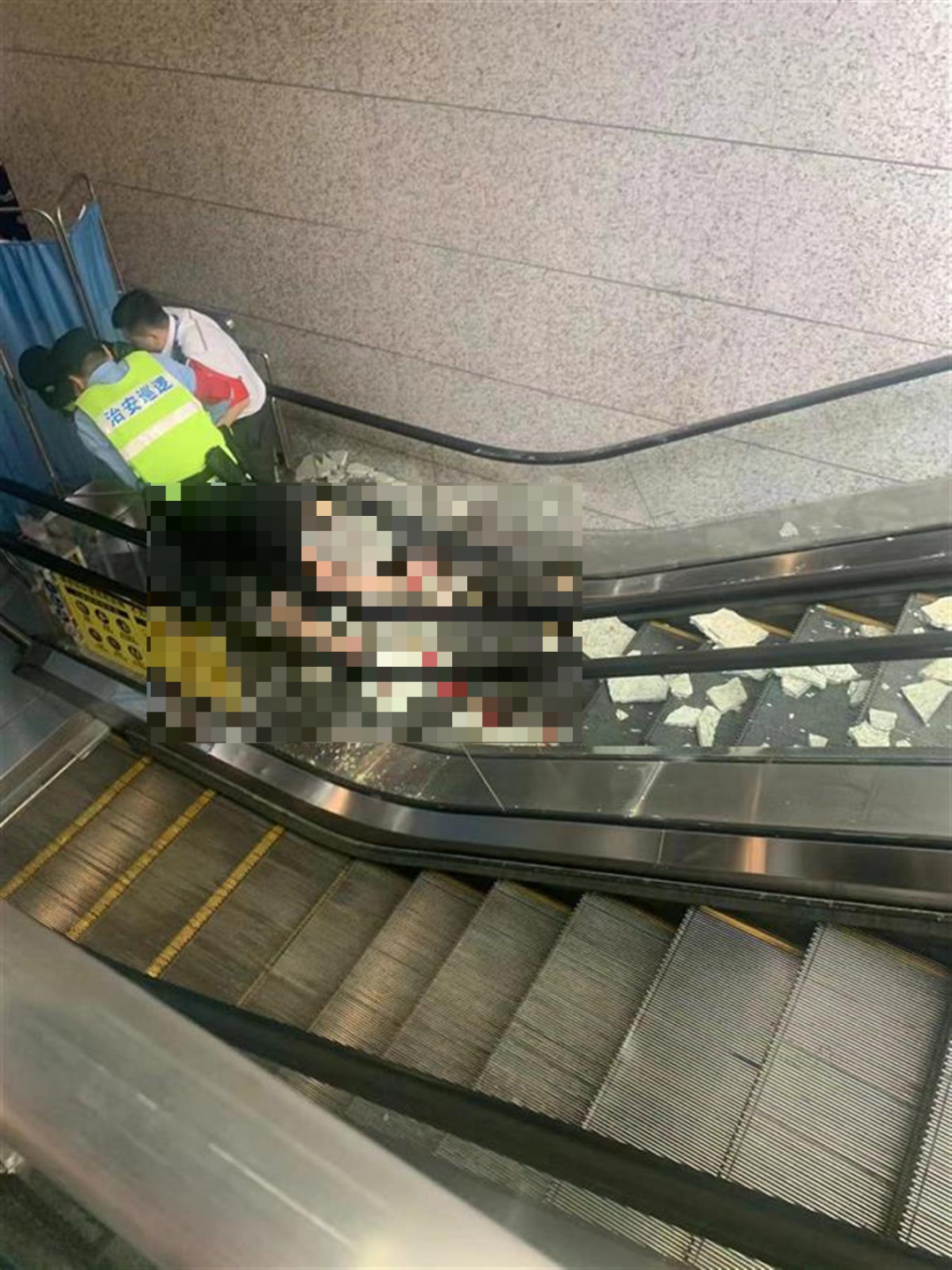 据张女士的亲属朱先生介绍,张女士在南坪附近开了一家店,事发时,她在去店里上班的路上,结果在乘坐轻轨3号线南坪站2号出入口的扶梯时,不幸被多块掉落的墙体瓷砖砸中,瘫倒在扶梯上,血流不止。