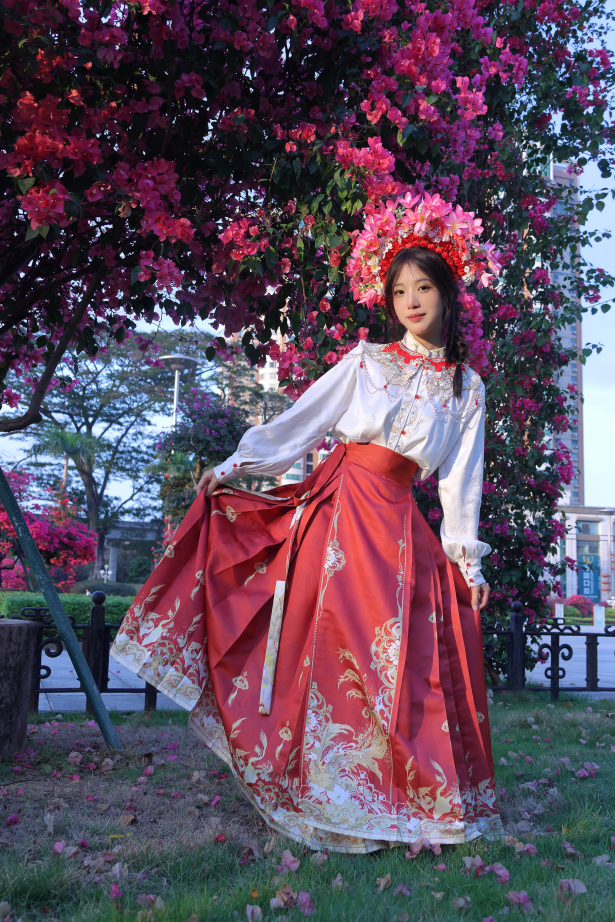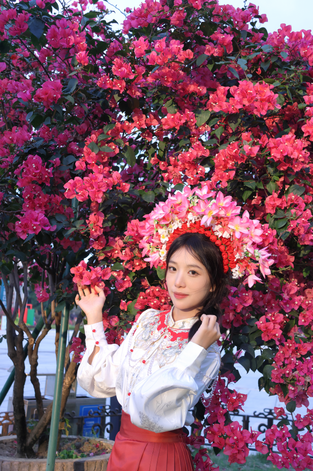 以花海作背景与头上的簪花配饰