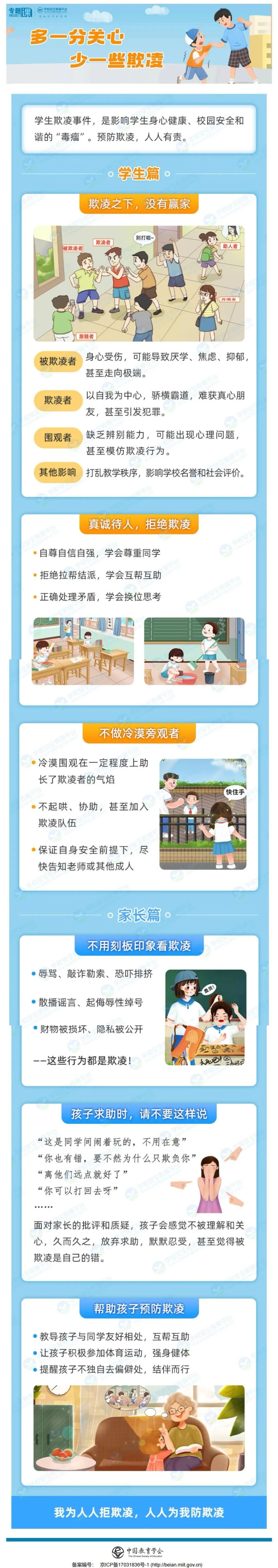 您好!为了加强学校与家长的沟通,预防孩子在学校和家里受到侵害。我校开展防欺凌知识宣传教育活动。现特邀请家长们一起学习。加深家校合作,共管共育,共筑孩子健康成长防护墙。