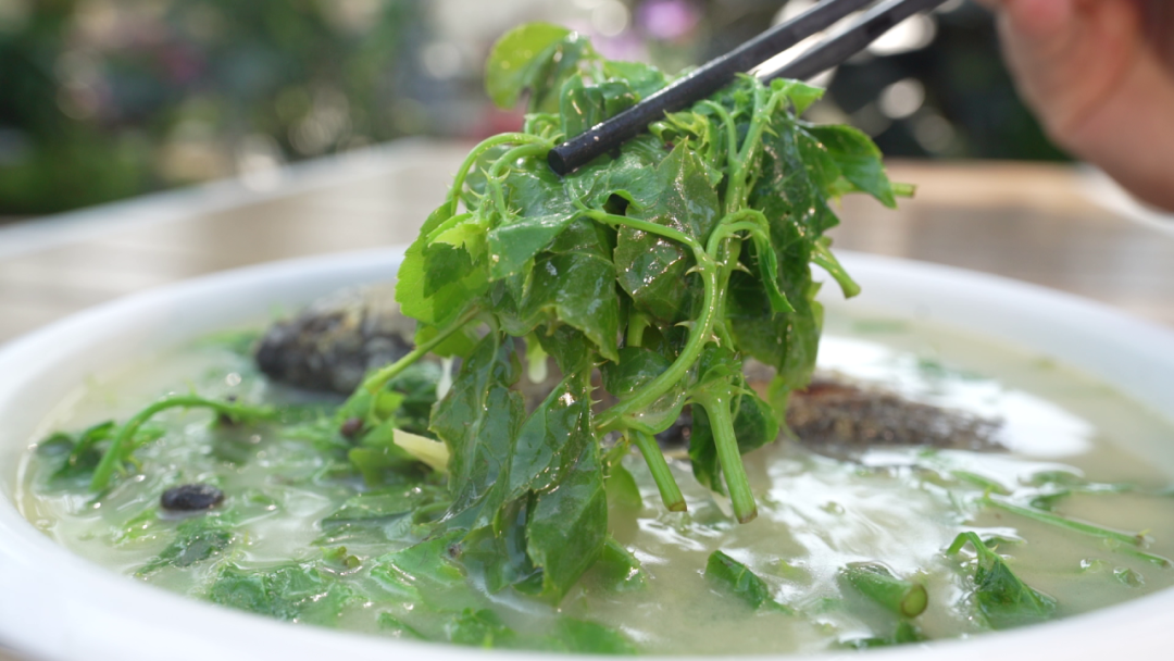 簕菜有解百毒之称,味道甘醇,芳香浓郁,具有清热排毒、消暑解渴、解烟酒、减肥、抗疲劳的功效。恩平簕菜鲫鱼汤以簕菜滚鲫鱼汤,尤其鲜美可口,还带有淡淡的薄荷清香味,为消暑气的食养佳品。