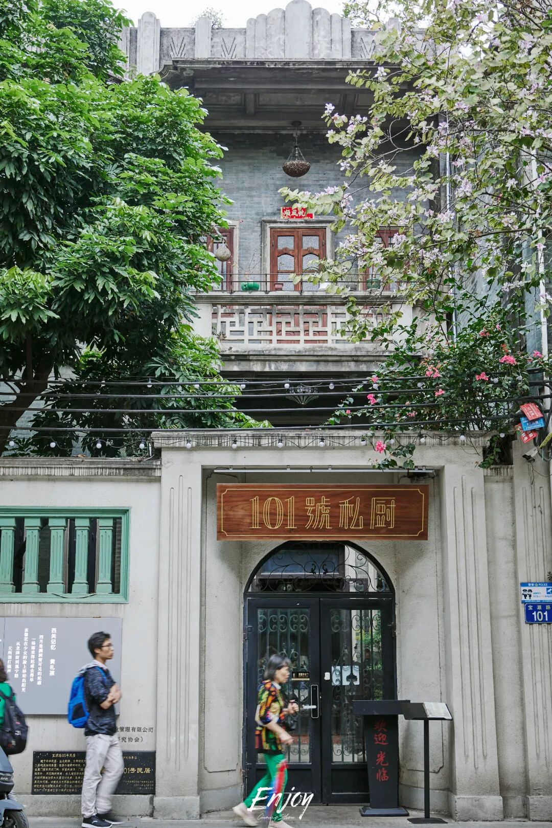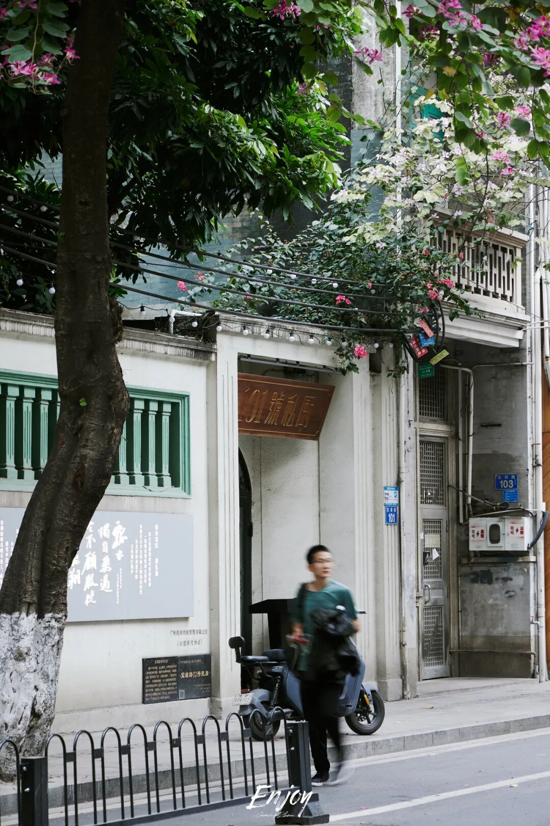 深入宝源路,被一簇簇花吸引住了目光,紫花、红花、绿叶正好与洋楼和谐相衬,旁边还有刻着与西关记忆相关的诗句墙面,灿烂的文化光景在阳光照射下闪闪发亮。这座独栋的建筑其实是一家私房菜,内部的美学秘密待你来探究~
