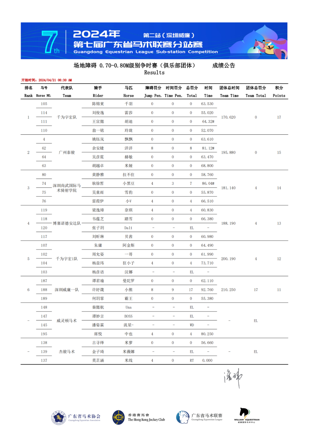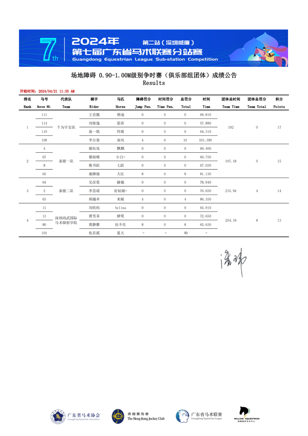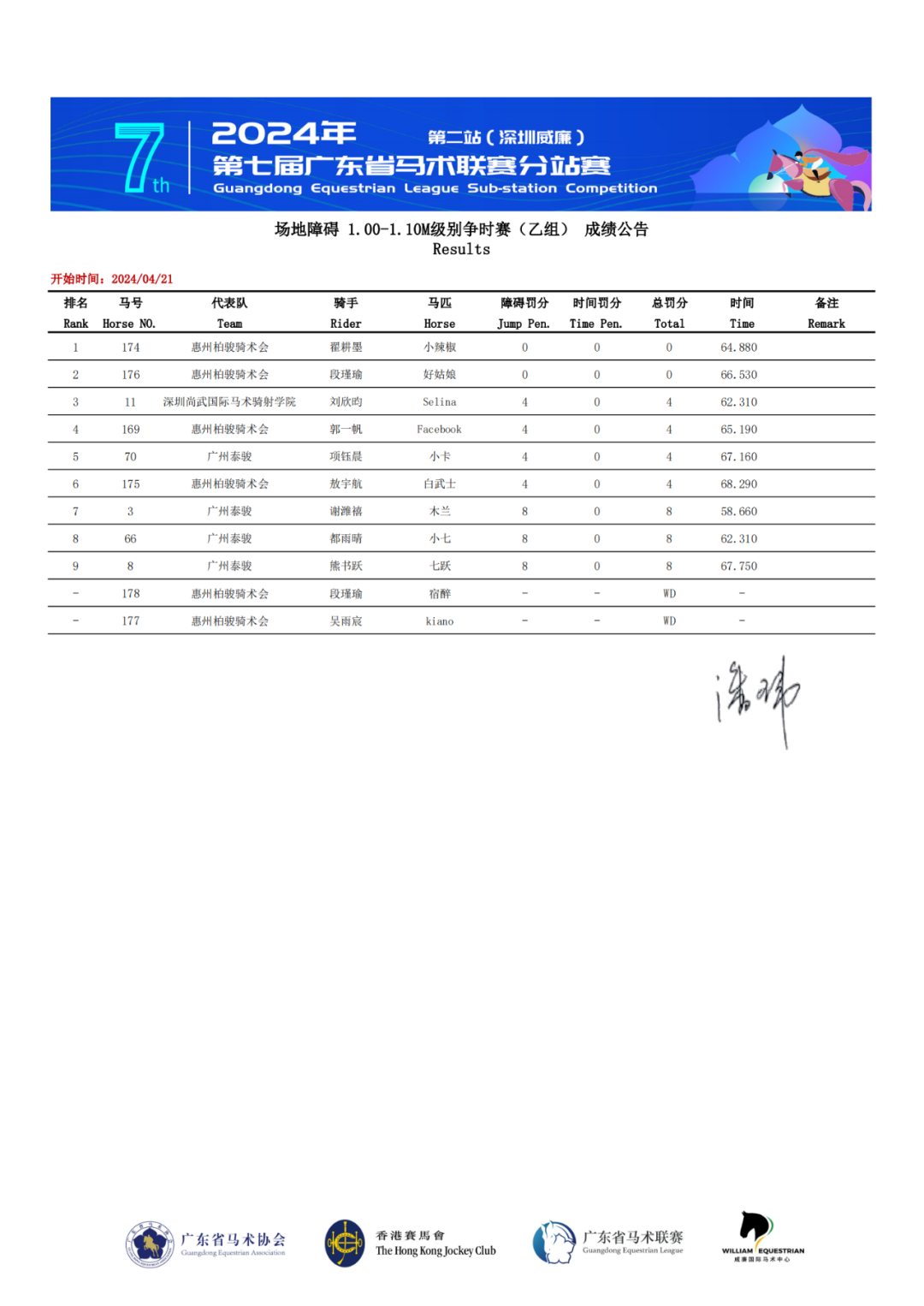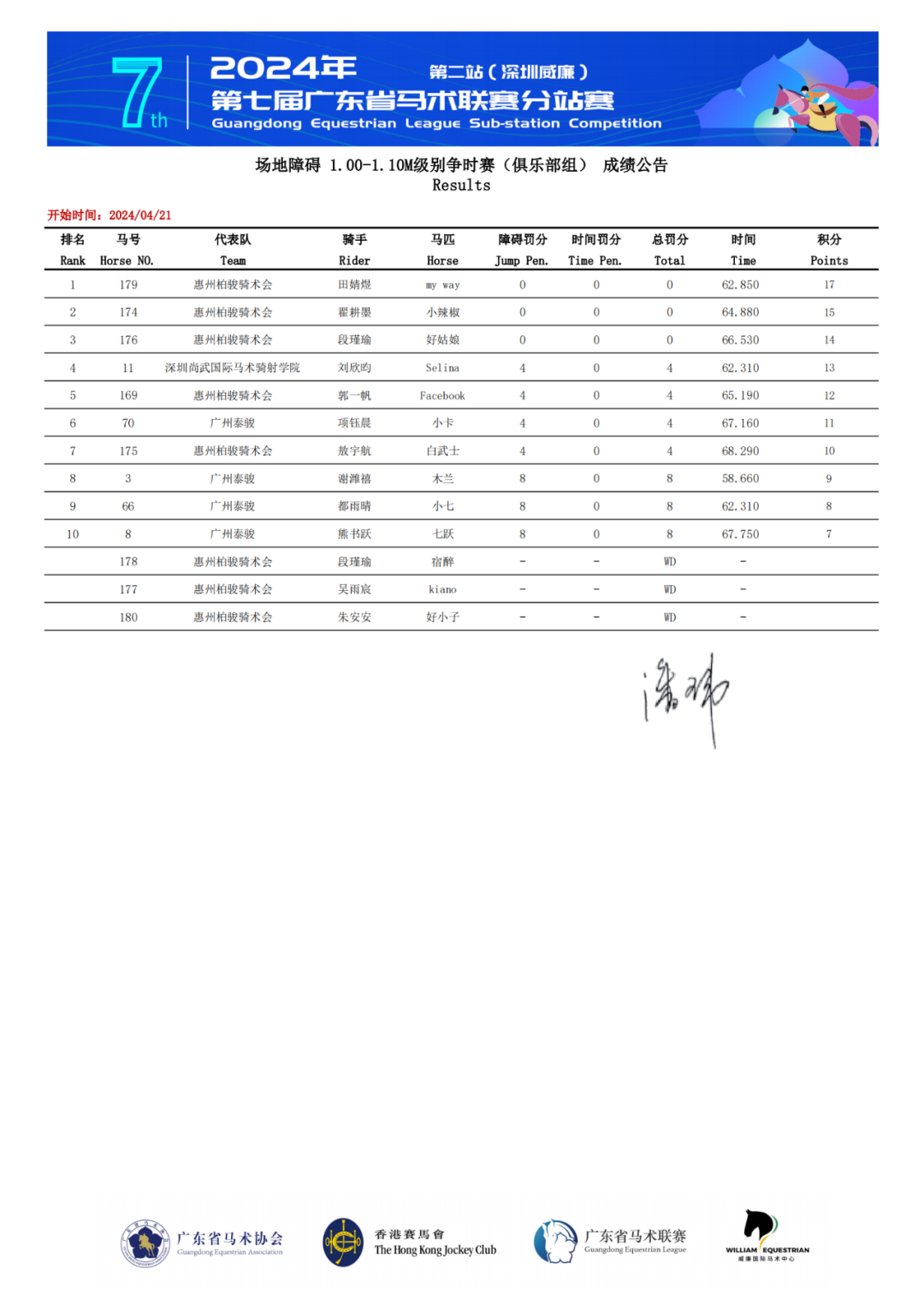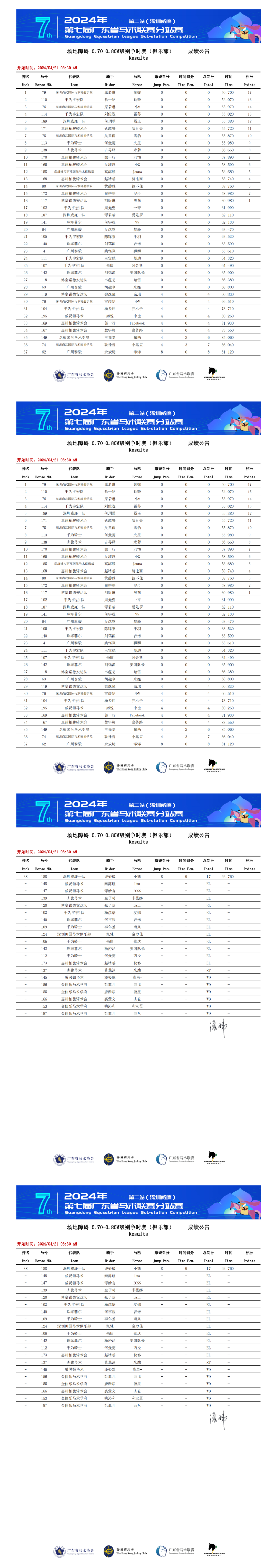 今日分别决出了场地障碍 0.70-0.80M级别争时赛(俱乐部团体)、场地障碍 0.70-0.80M级别争时赛(俱乐部)、场地障碍 0.70-0.80M级别争时赛(职业组)、场地障碍 0.90-1.00M级别争时赛(俱乐部组团体)、场地障碍 0.90-1.00M级别争时赛(俱乐部组)、场地障碍 0.90-1.00M级别争时赛(职业组)、场地障碍 1.00-1.10M级别争时赛(职业组)、场地障碍 1.00-1.10M级别争时赛(乙组)、场地障碍 1.00-1.10M级别争时赛(俱乐部组)以及场地障碍 1.30M级别一轮争时赛+附加赛(公开组)的冠军。