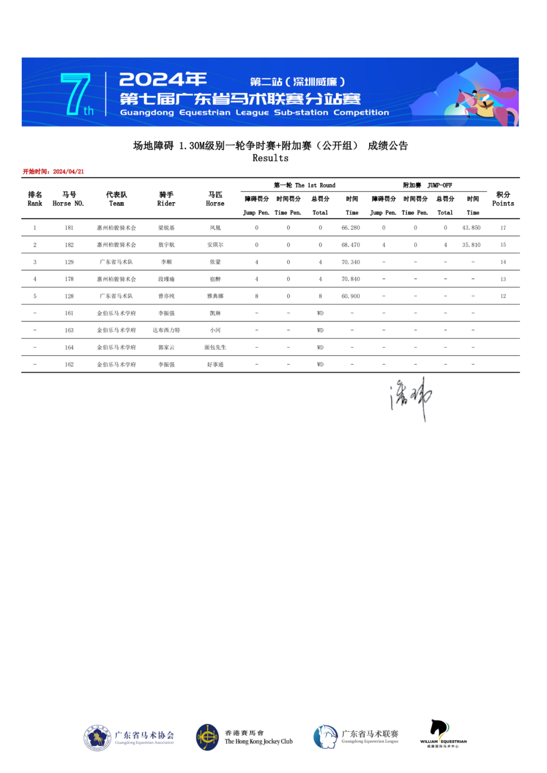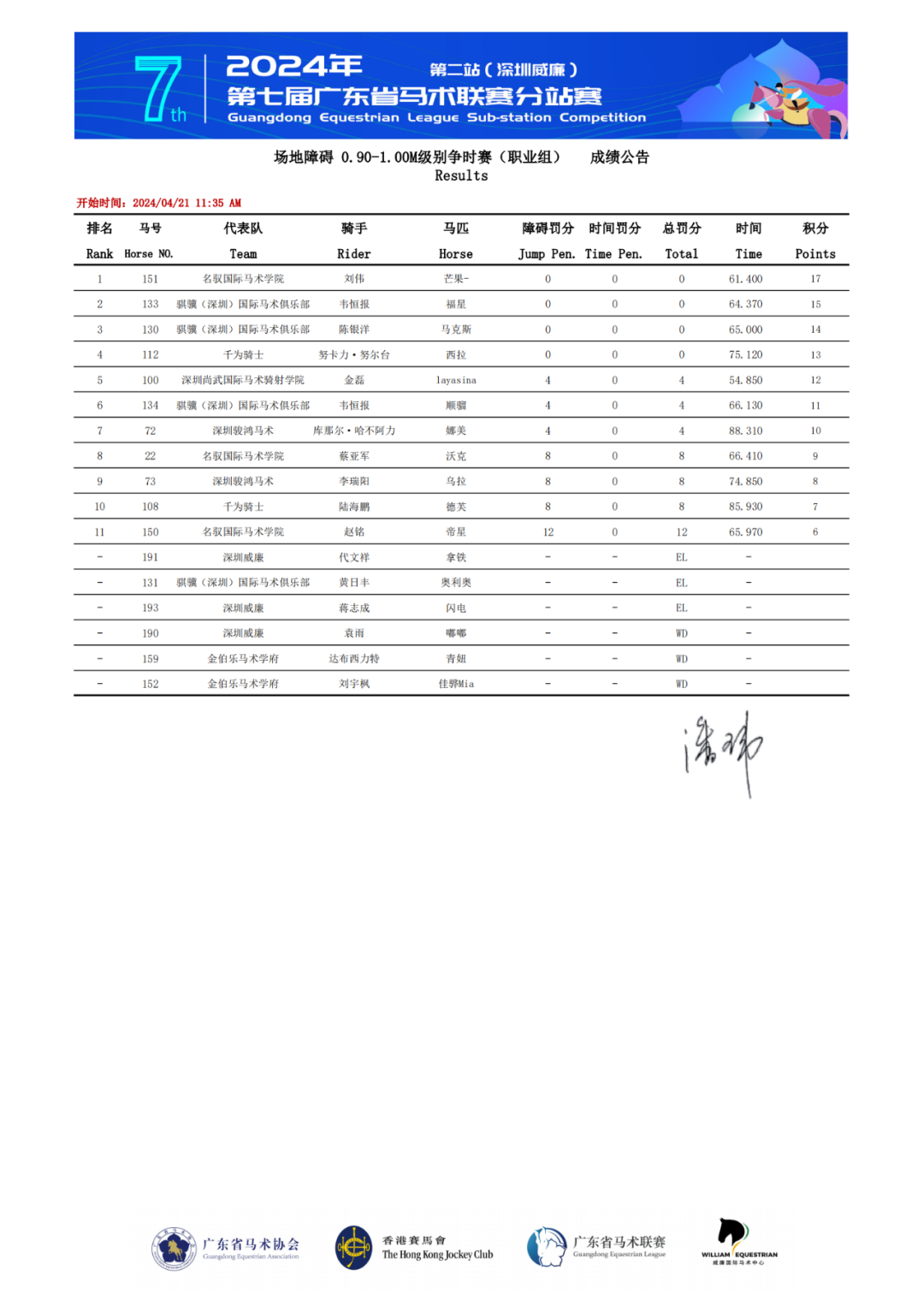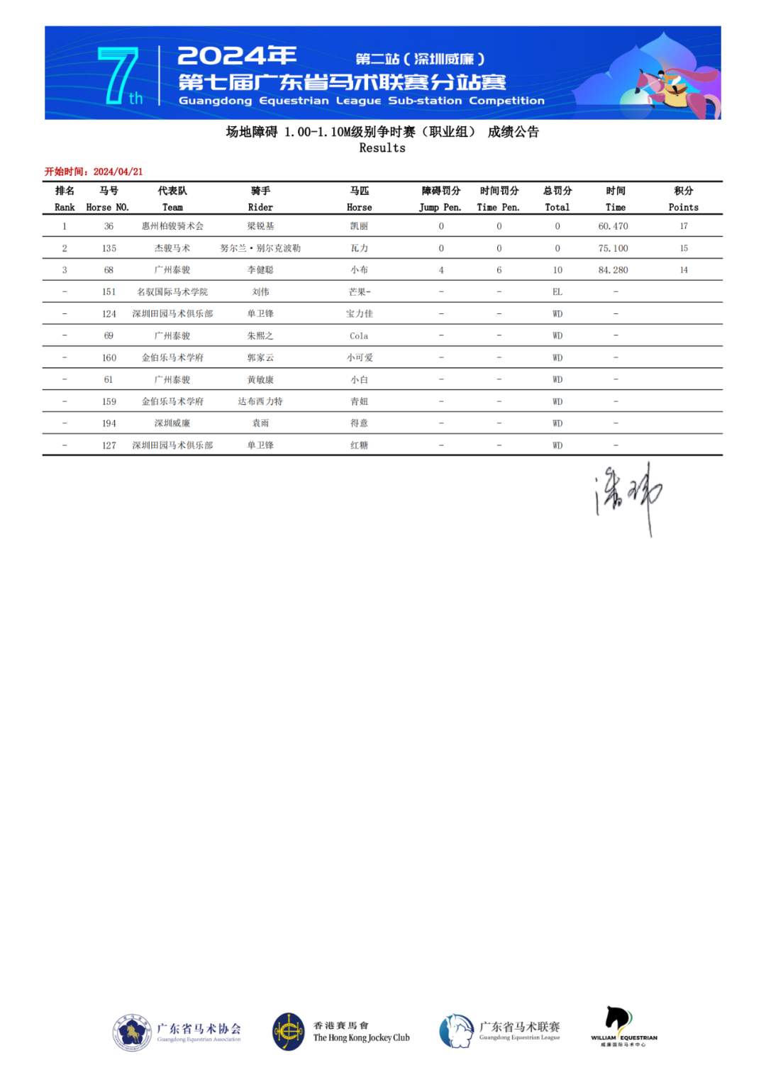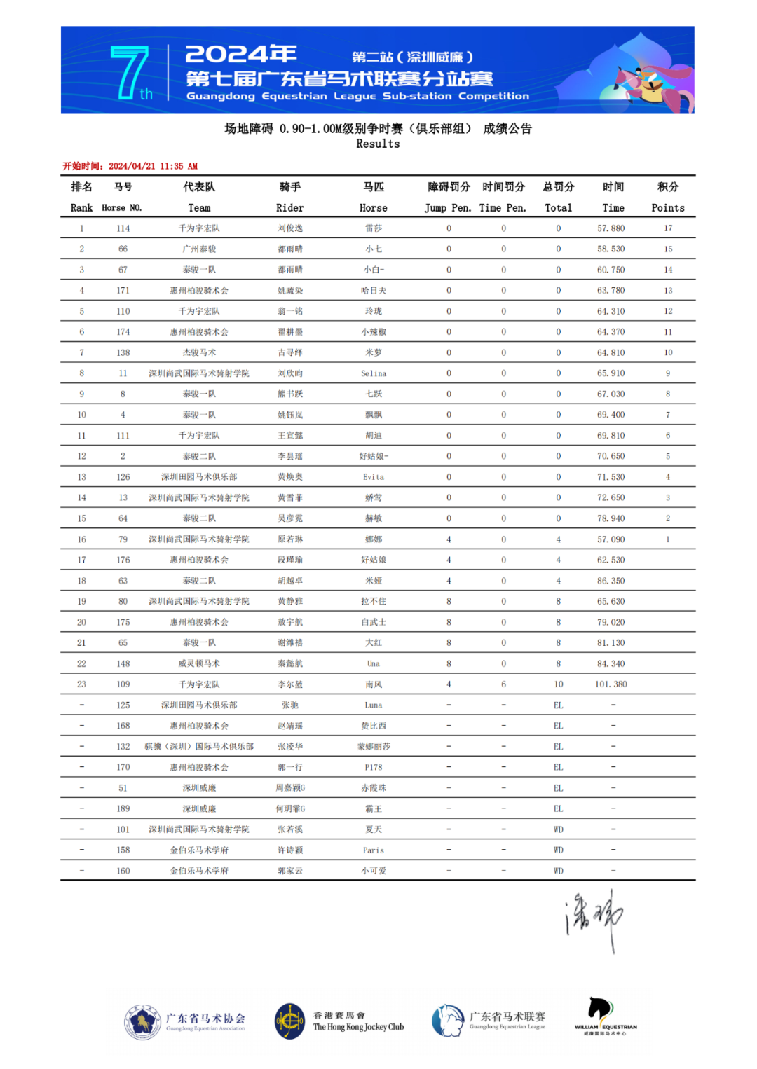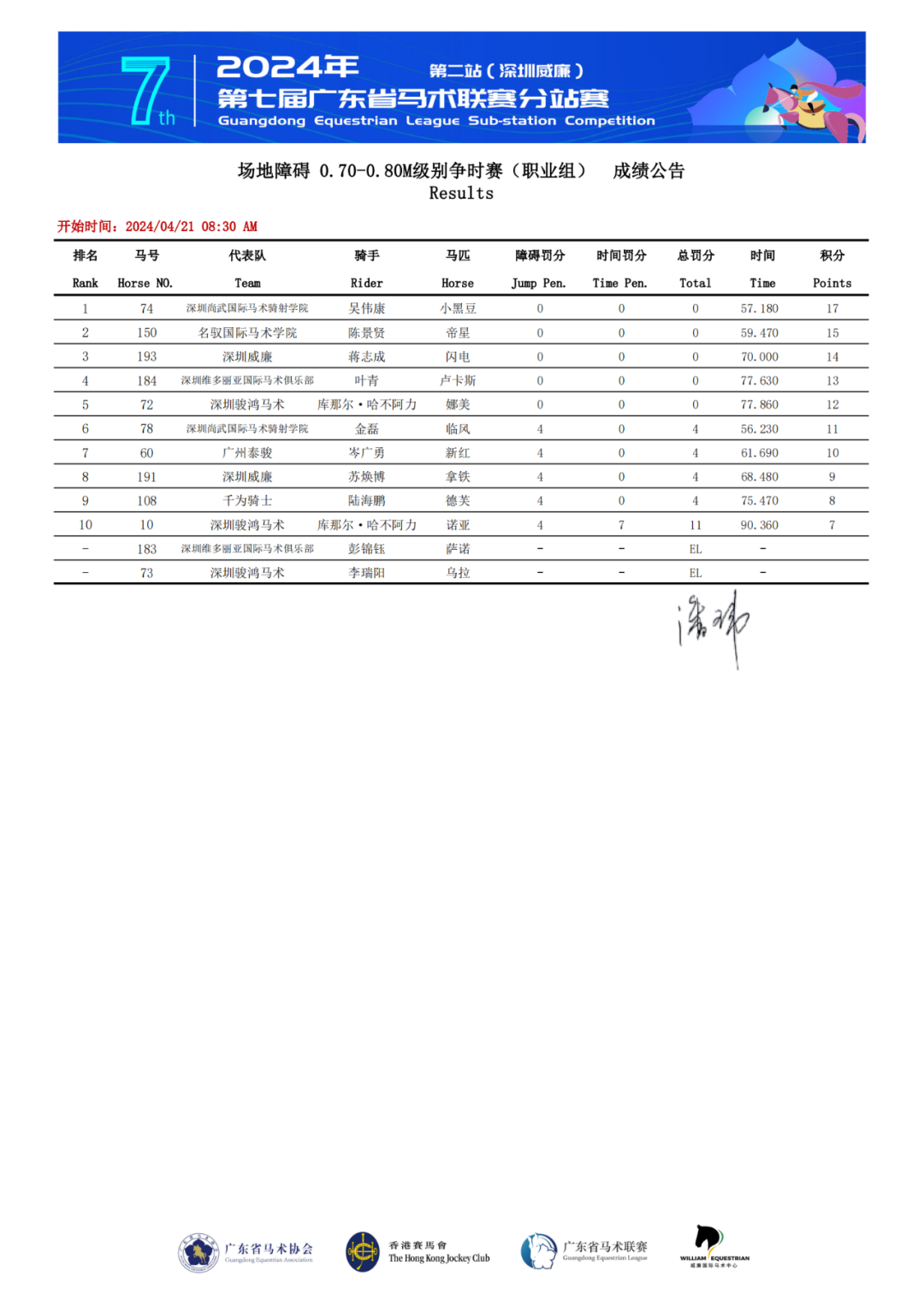 今日分别决出了场地障碍 0.70-0.80M级别争时赛(俱乐部团体)、场地障碍 0.70-0.80M级别争时赛(俱乐部)、场地障碍 0.70-0.80M级别争时赛(职业组)、场地障碍 0.90-1.00M级别争时赛(俱乐部组团体)、场地障碍 0.90-1.00M级别争时赛(俱乐部组)、场地障碍 0.90-1.00M级别争时赛(职业组)、场地障碍 1.00-1.10M级别争时赛(职业组)、场地障碍 1.00-1.10M级别争时赛(乙组)、场地障碍 1.00-1.10M级别争时赛(俱乐部组)以及场地障碍 1.30M级别一轮争时赛+附加赛(公开组)的冠军。