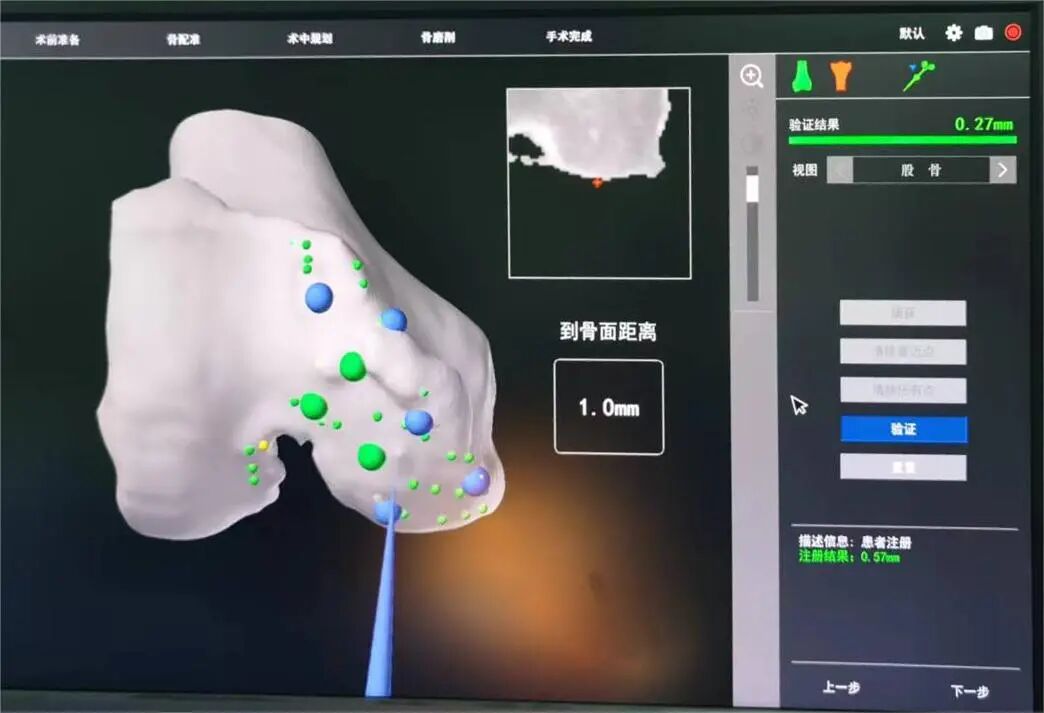 在机器人辅助下,医生能将高难度的手术做到十分精细。在手术开始的时候,机器人需要通过探针寻找标记点,反复地校准直到所有点位通过并显示绿色。多个维度上的校准使得手术十分精准。
