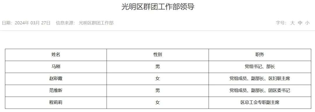 本次调整后的光明区群团工作部领导班子共有4名成员,分别是群团工作部党组书记、部长马刚;群团工作部党组成员、副部长、区妇联主席赵彩霞;群团工作部党组成员、副部长、团区委书记范维新;区总工会专职副主席程莉莉。