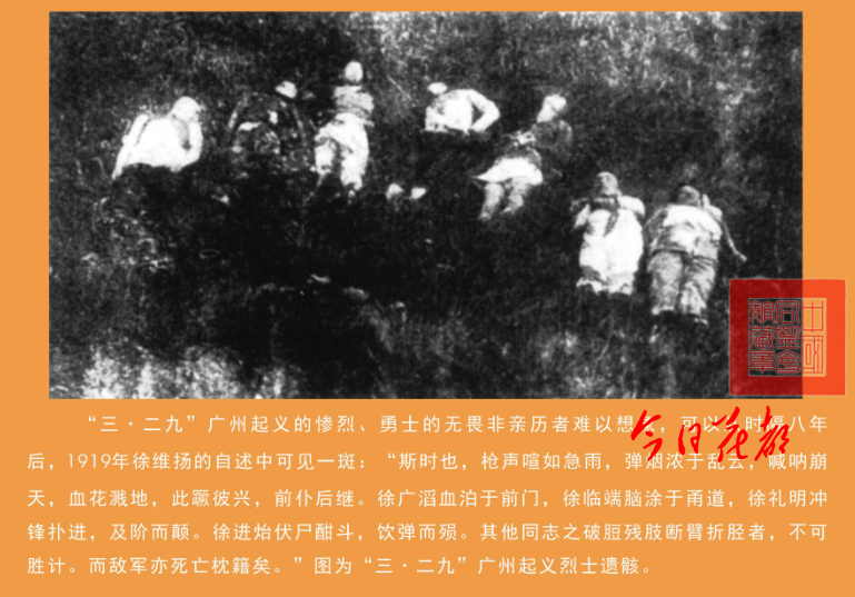 “三·二九”黄花岗起义的惨烈、勇士的无畏非亲历者难以想象,可以从时隔八年后,1919年徐维扬的自述中可见一斑:“斯时也,枪声喧如急雨,弹烟浓于乱云,喊呐崩天,血花溅地,此蹶彼兴,前仆后继。徐广滔血泊于前门,徐临端脑涂于甬道,徐礼明冲锋扑进,及阶而颠。徐进炲伏尸酣斗,饮弹而殒。其他同志之破脰残肢断臂折胫者,不可胜计。而敌军亦死亡枕籍矣。”