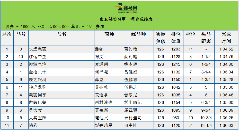 安排在第七场举行的富卫保险冠军一哩赛(总奖金二千二百万港元),由潘顿策骑出赛的“永远美丽”率先冲线,爆冷夺冠!