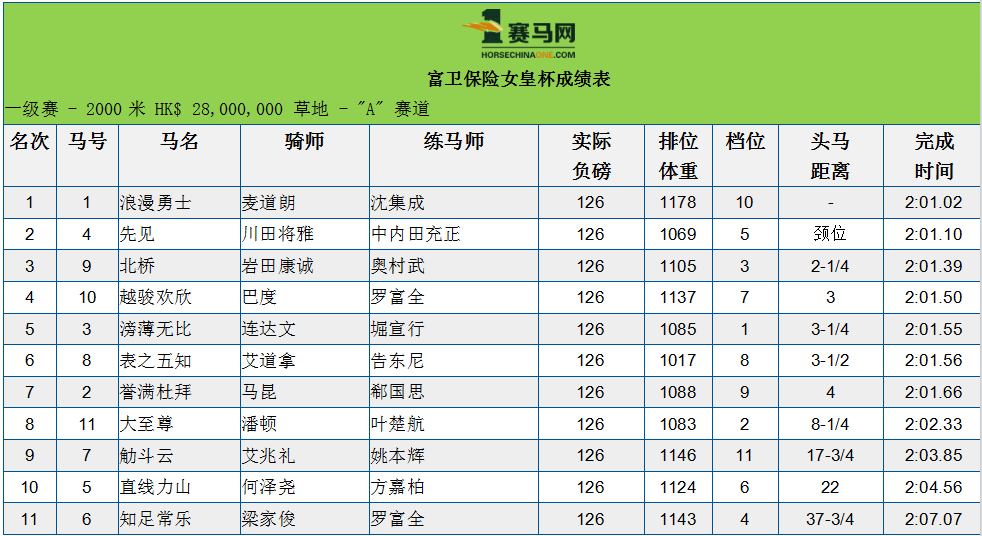 富卫保险女皇杯方面,今年共有11匹赛驹出战此赛,最终“浪漫勇士”在骑师麦道朗胯下不负众望夺冠,成为历来首匹三胜此赛的佳驷。