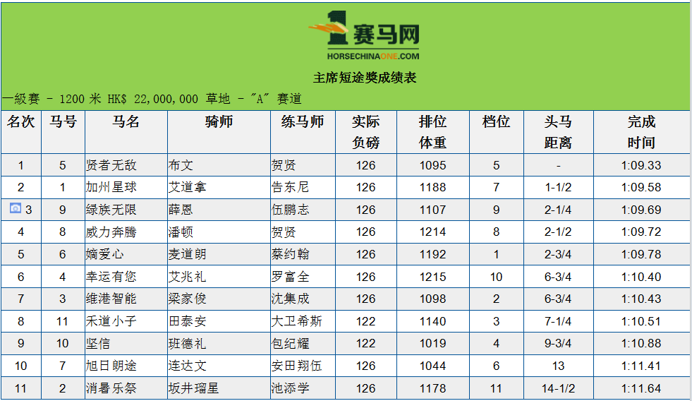 安排在第五场举行的主席短途奖(1200米,总奖金二千二百万港元),共有9匹马出赛。最终,由骑师布文策骑的5号马“贤者无敌”击败告东尼训练的“加州星球”夺冠。