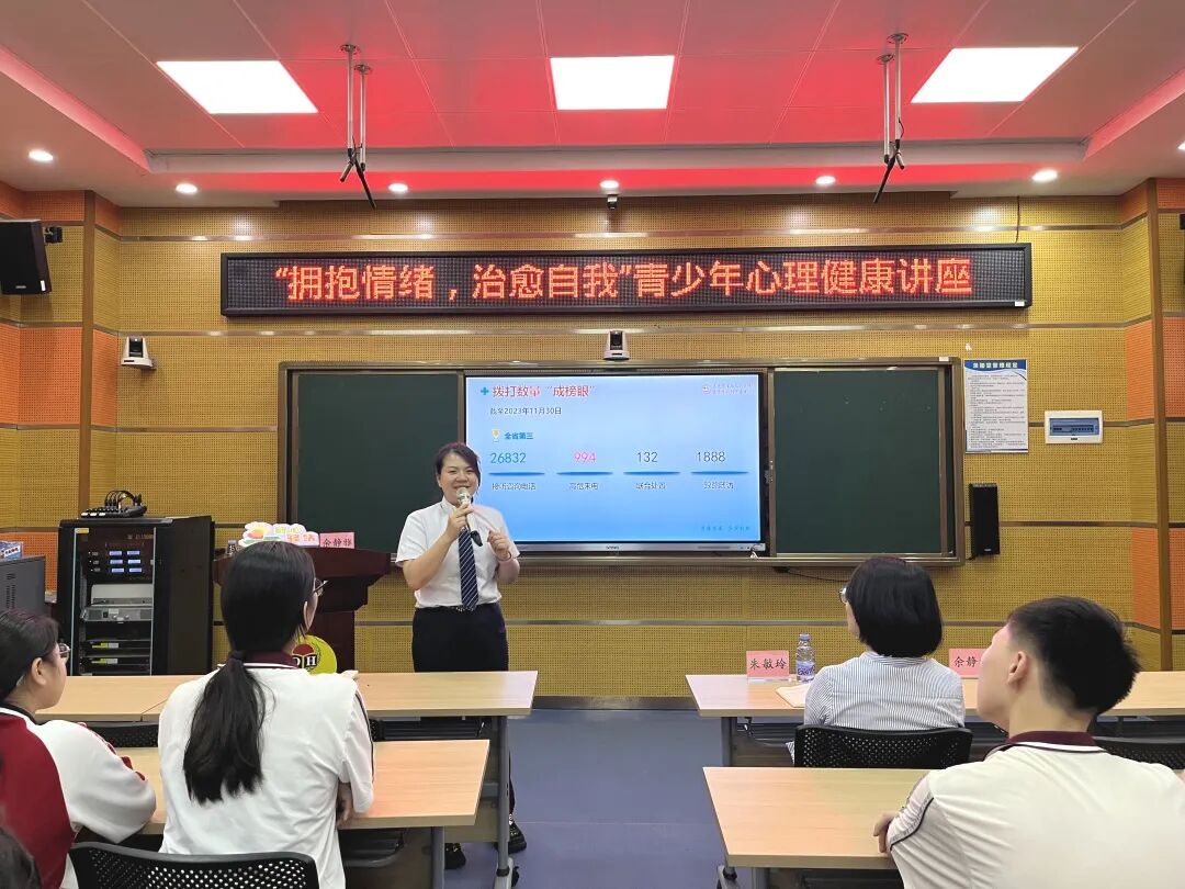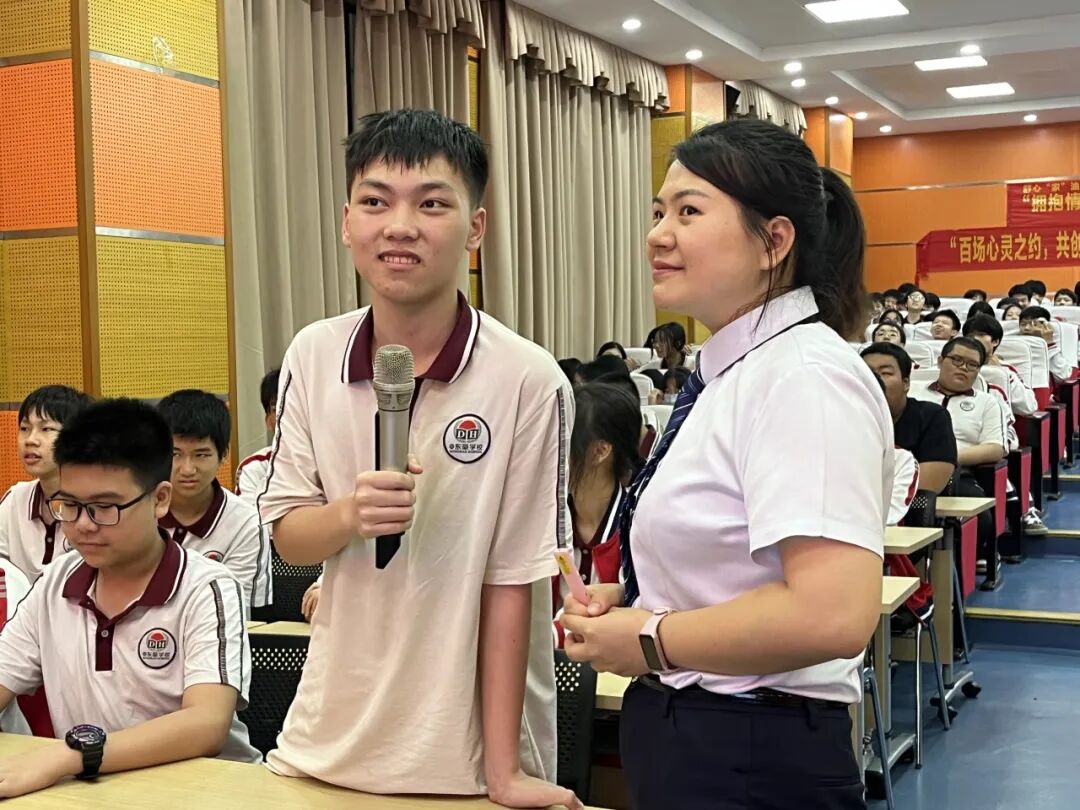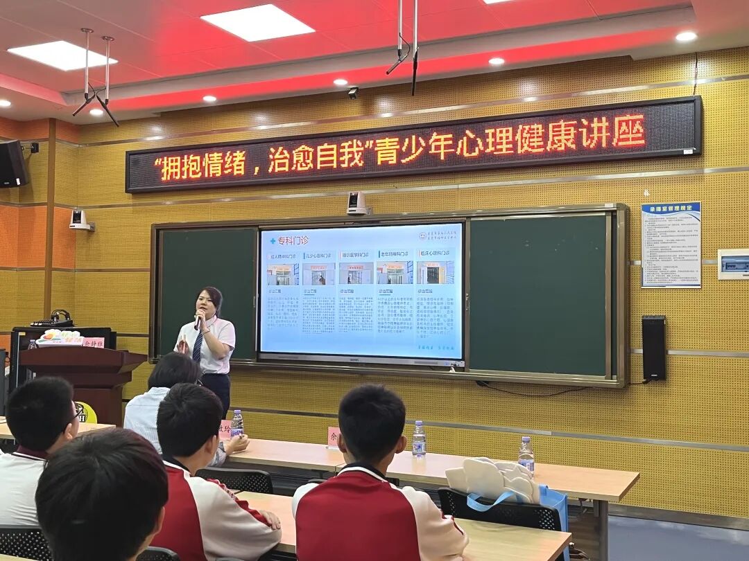 讲座由东莞市第七人民医院社会心理服务办公室主任助理余静雅主讲。余医生以“我是谁?”“如何与老师、同学、家长和谐共处?”等问题引导学生进行思考,主要围绕认识自己、认识健康、成长的烦恼、认识情绪、拥抱情绪等五方面进行讲解。