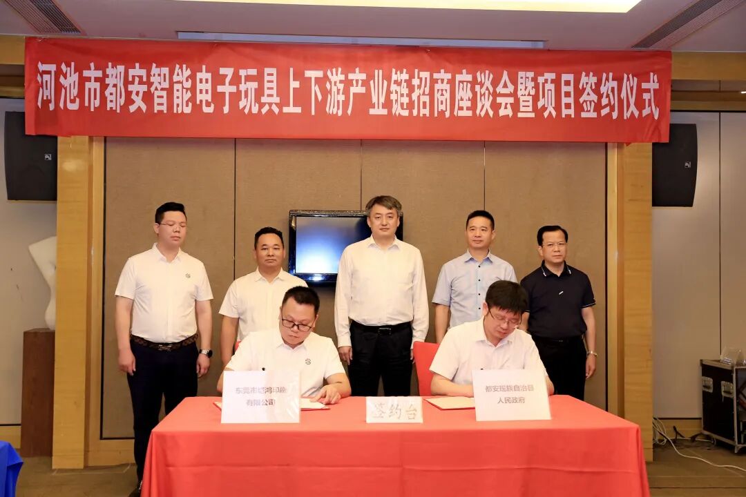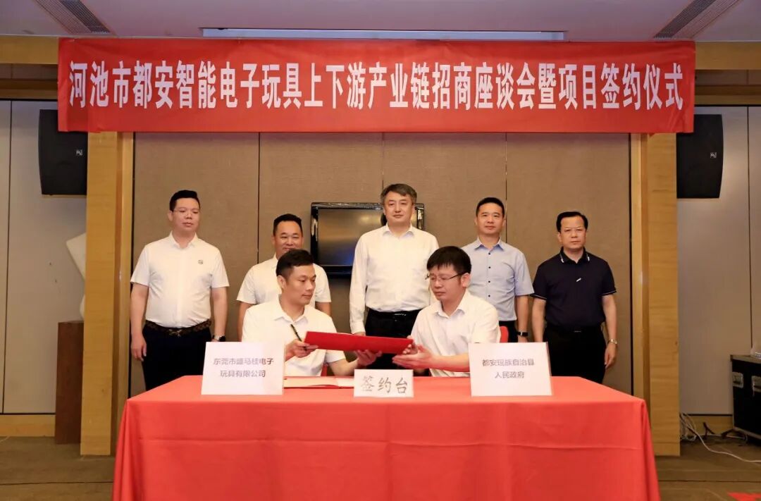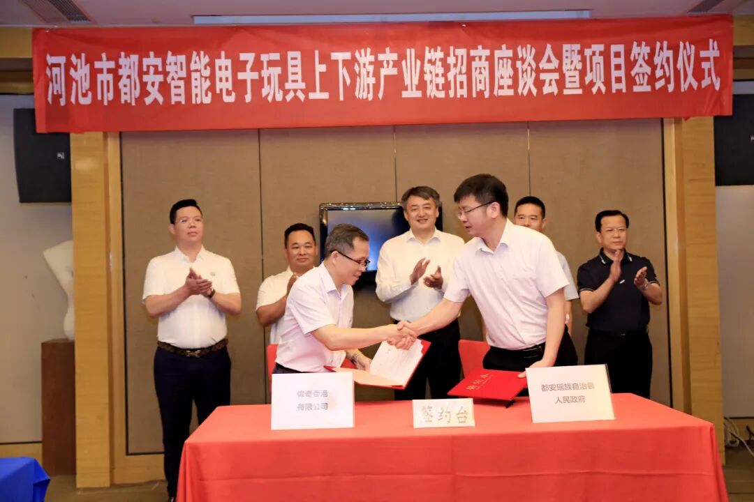 都安瑶族自治县人民政府分别与我商会常务副会长单位——东莞市盛马桂电子玩具有限公司、副会长单位——东莞市恺鸿印刷有限公司以及偉奇香港有限公司代表签署投资协议。这一协议的签署,标志着各方将围绕优势互补、资源共享、相互促进、共同发展的目标展开紧密合作,预示着河池市都安县智能电子玩具上下游产业链项目将早日落地。