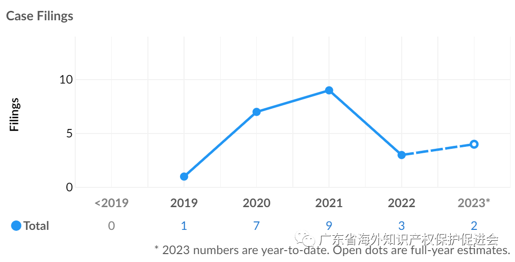 Grumpy Cat于2019年开始对广东企业发起诉讼,此后诉讼频率有所上升,2021年诉讼量达到峰值9起。截至目前,涉粤案件22起。值得注意的是,2023年新发起的2起诉讼涉及广东企业,反映出广东企业依然是Grumpy Cat的维权目标。