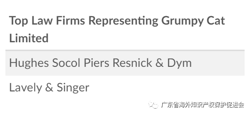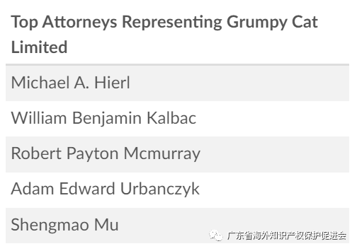 Grumpy Cat委托的律所共两家,分别为Hughes Socol Piers Resnick & Dym和Lavely & Singer,主要代理律师为Michael A. Hierl、William Benjamin Kalbac、Robert Payton Mcmurray等。
