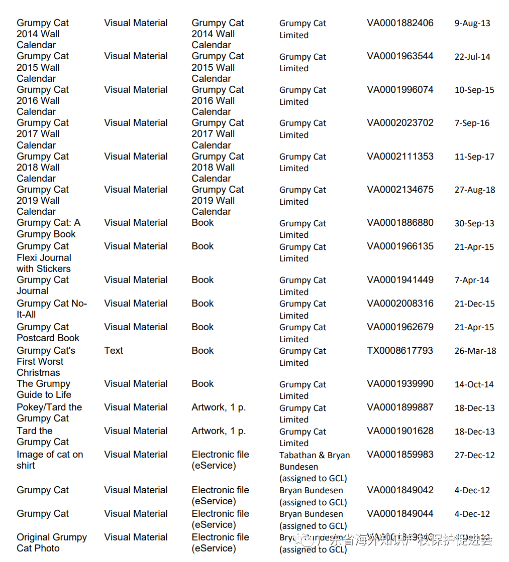 此外,Grumpy Cat对其部分作品进行了著作权登记,列表如下所示。