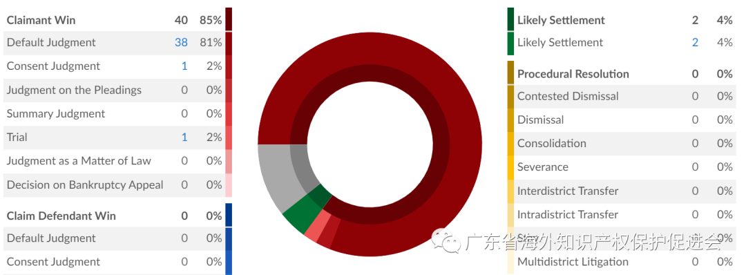 从案件结果上看,在Grumpy Cat发起的45起知识产权诉讼中,有42起已经结案,平均审理周期为195天。在42起已结案件中,有40起Grumpy Cat胜诉,0起Grumpy Cat败诉,2起和解结案,原告胜诉比例高。