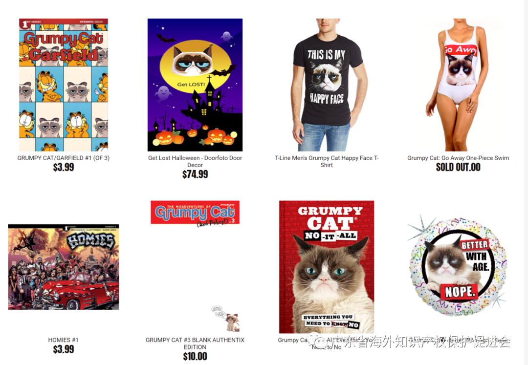 除了印有Grumpy Cat猫真实图片的产品外,涉案产品也包括印有其卡通漫画的相关产品。