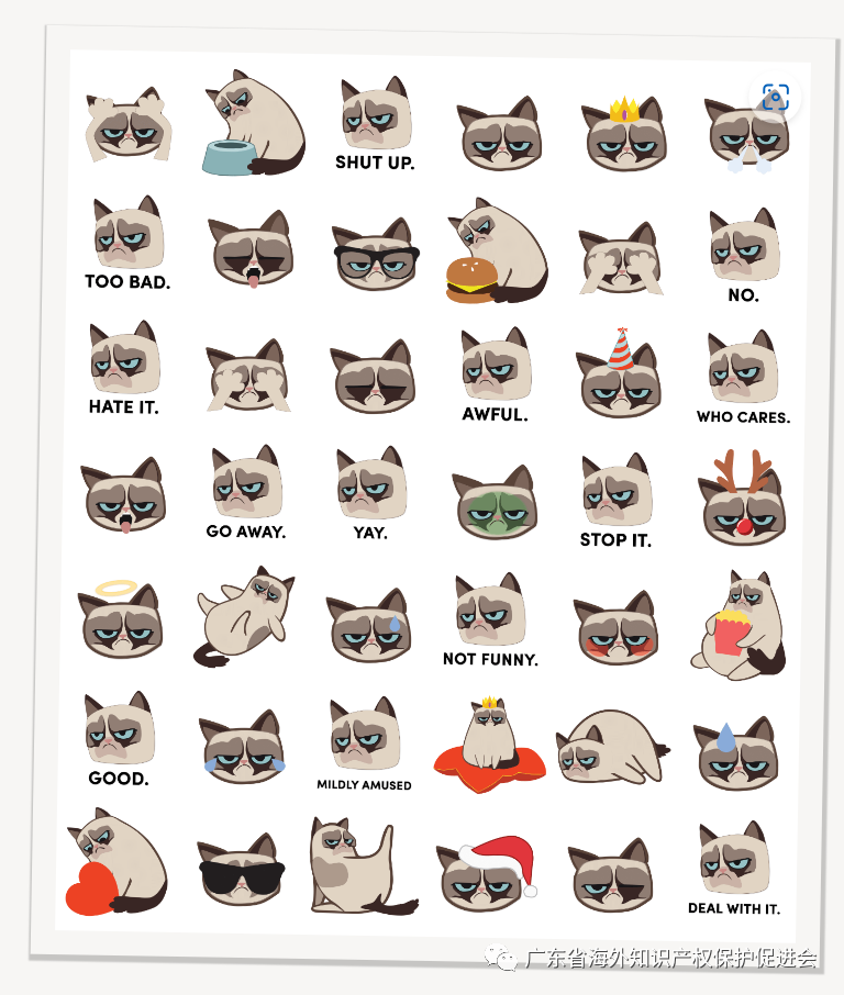 涉案产品主要为印有Grumpy Cat猫表情的周边产品,包括贴纸、服饰、香氛、抱枕、气球、手机壳、马克杯等。