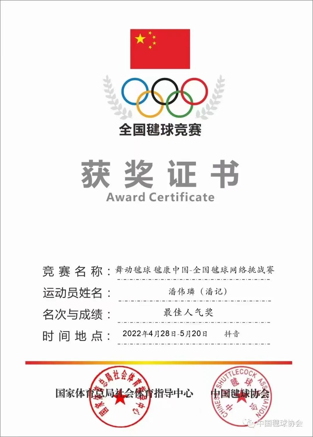 潘伟璘参加由国家体育总局群体司、中华全国体育总会群体部主办的“全民健身线上运动会”毽球技能展示大赛荣获“最佳人气奖”获奖证书